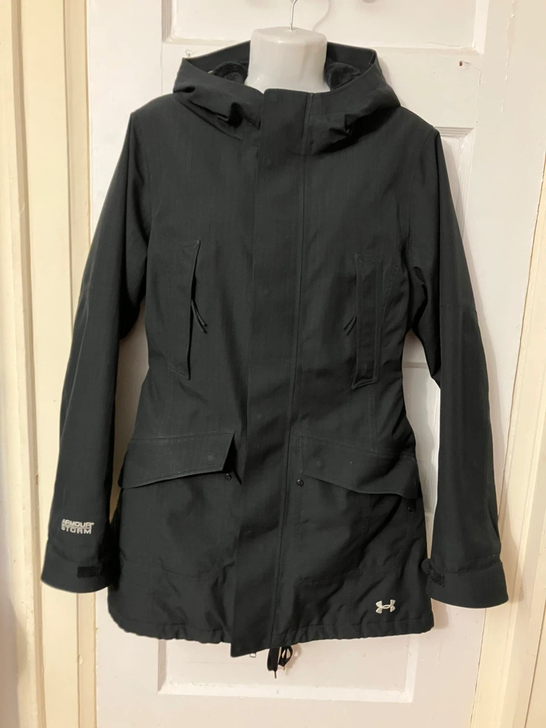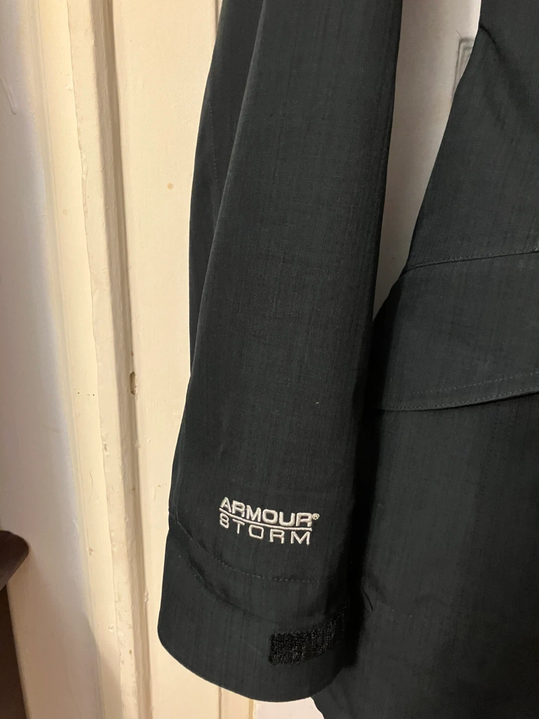 Selling a gently used Under Armour Armour Storm jacket in black. It's a size medium and features the Armour Storm technology, making it water-resistant and breathable. Great for all kinds of weather!