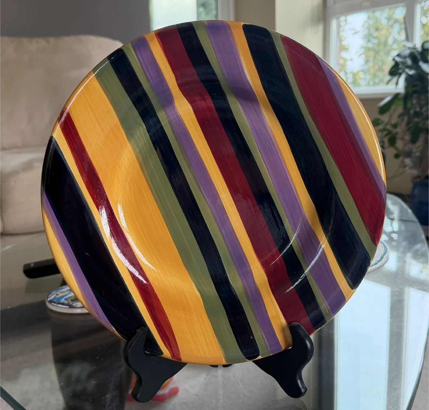Selling a decorative plate with colourful stripes. It has stripes of yellow, red, purple, black, and green. Perfect for adding a pop of colour to your home decor!