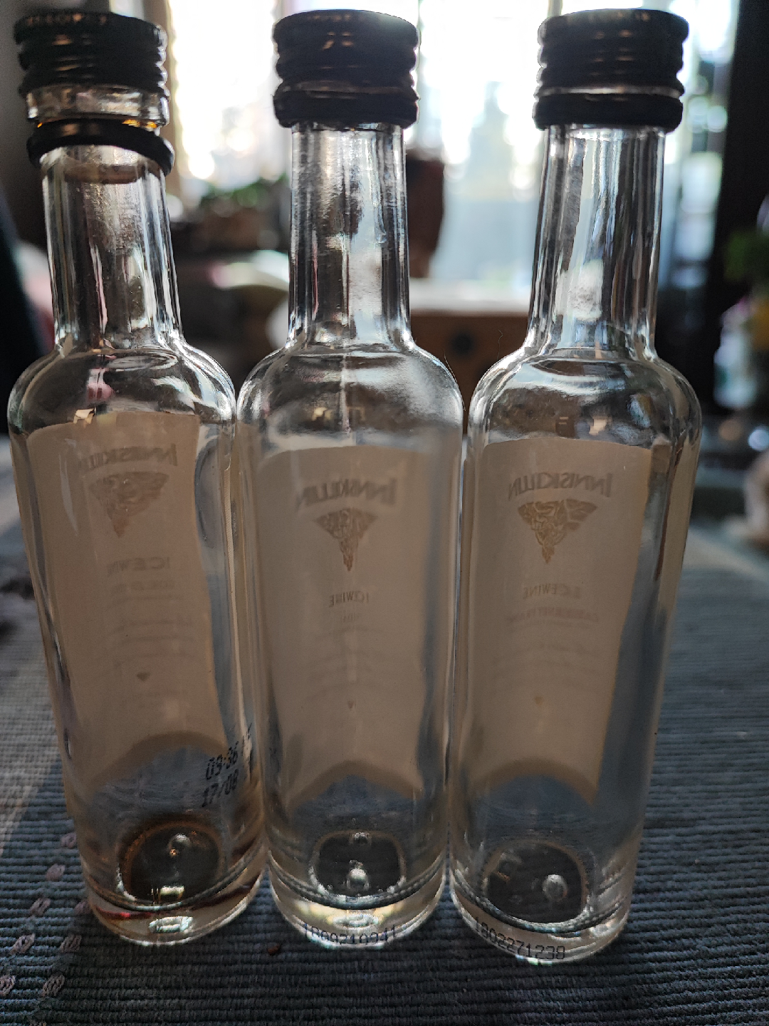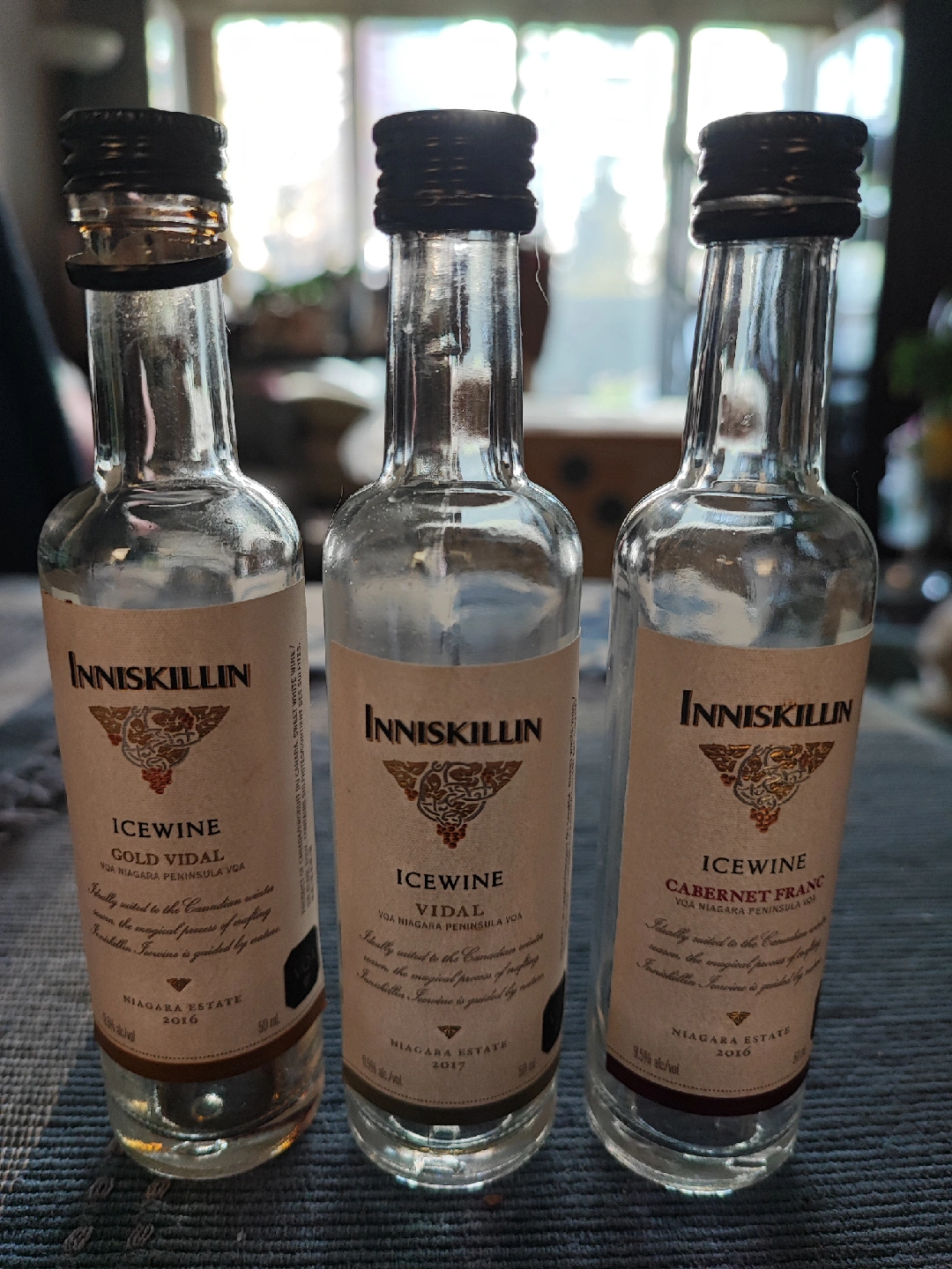 A set of Inniskillin Icewine bottles (empty). There are three bottles in total, including Gold Vidal, Vidal, and Cabernet Franc varieties. The bottles are approximately 14 cm in high. Perfect for collectors or those interested in unique bottles!