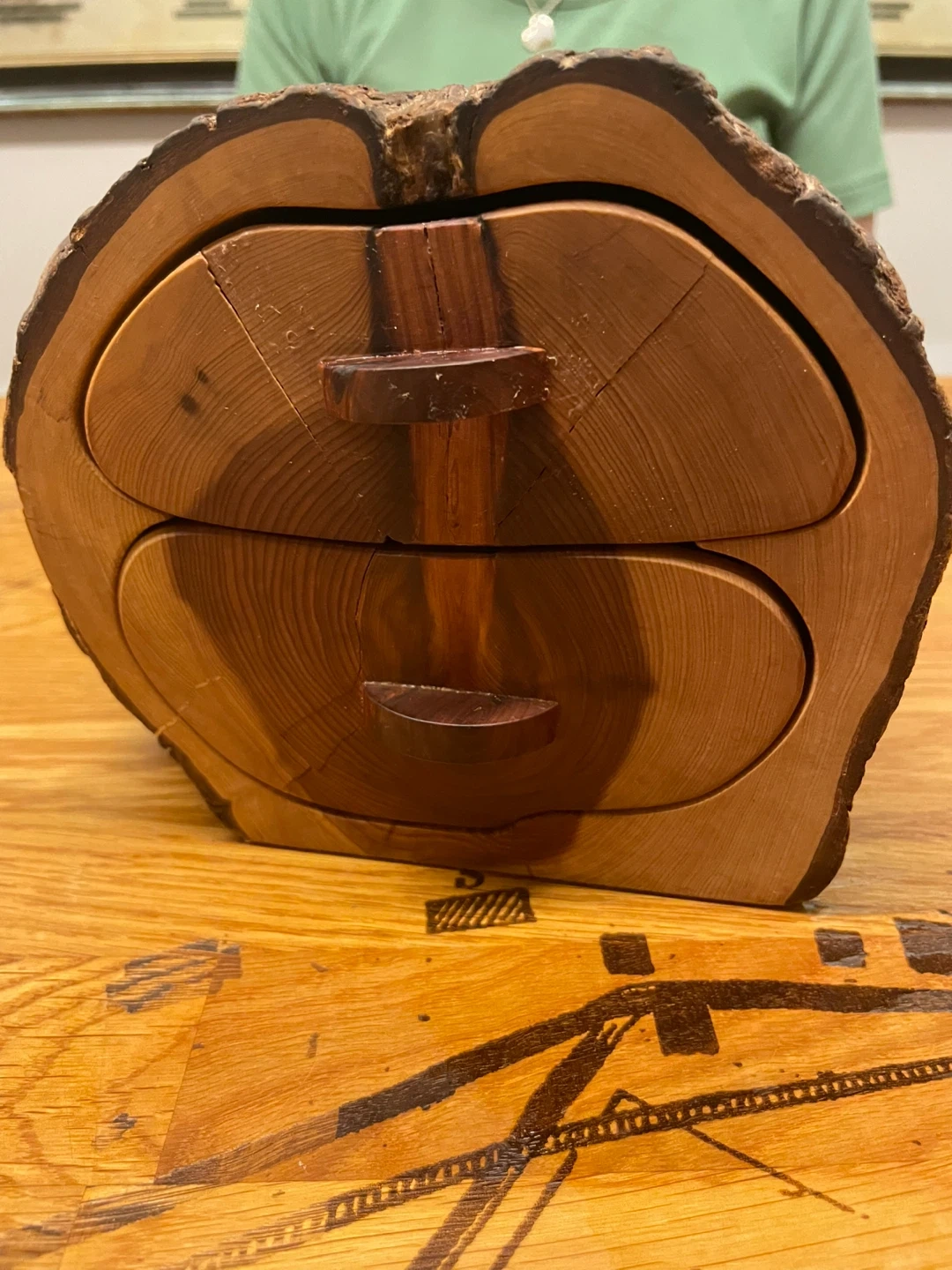 Selling a unique, handmade wooden jewelry box. It features a rustic design with two drawers, perfect for storing your precious items. The natural wood grain adds a touch of warmth to any space