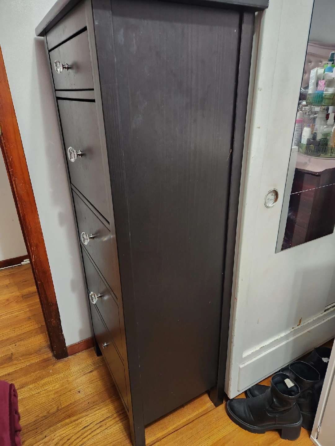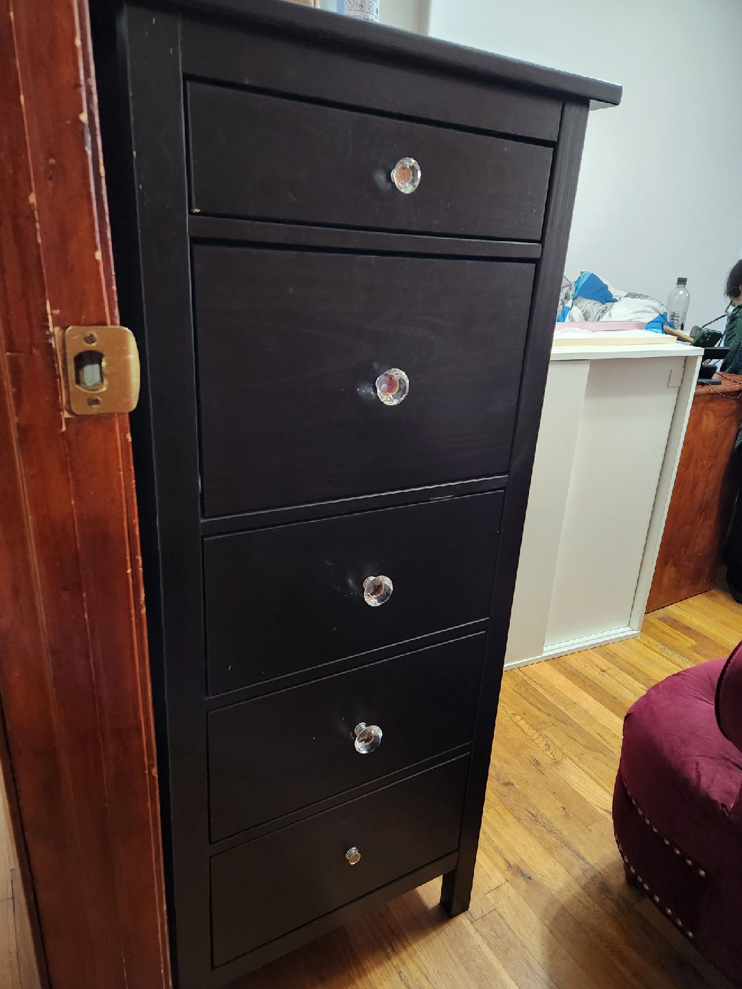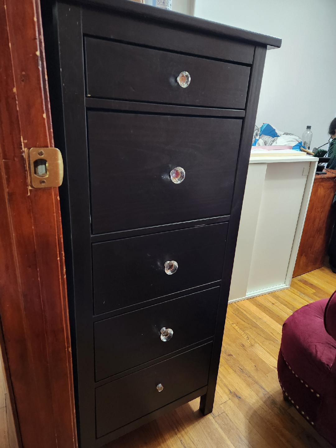 Selling a black 6-drawer dresser. It features crystal knobs on each drawer. Great for adding a touch of elegance to your bedroom or closet!