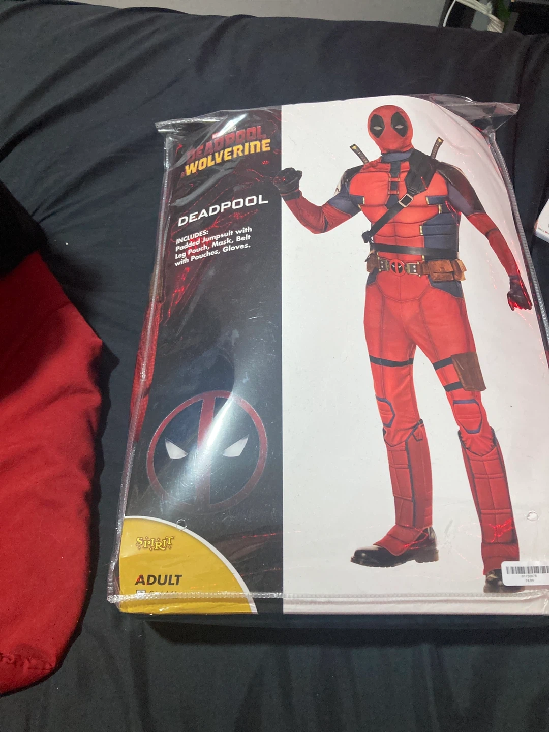 Selling a brand new, in-package Deadpool costume for adults! Includes the padded jumpsuit with pouch, mask, and belt with pouches and gloves. Perfect for Halloween or cosplay!