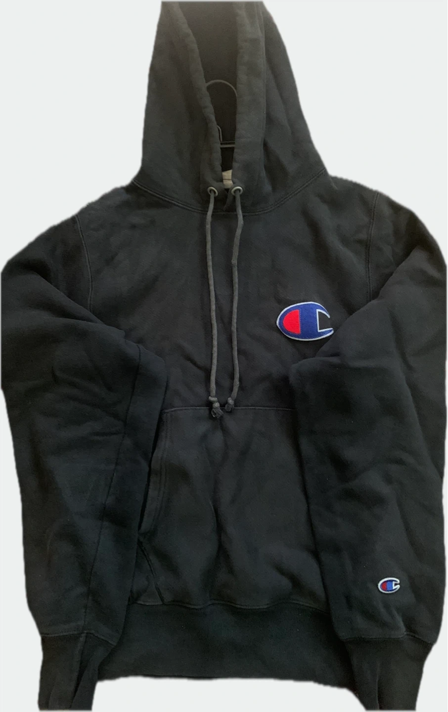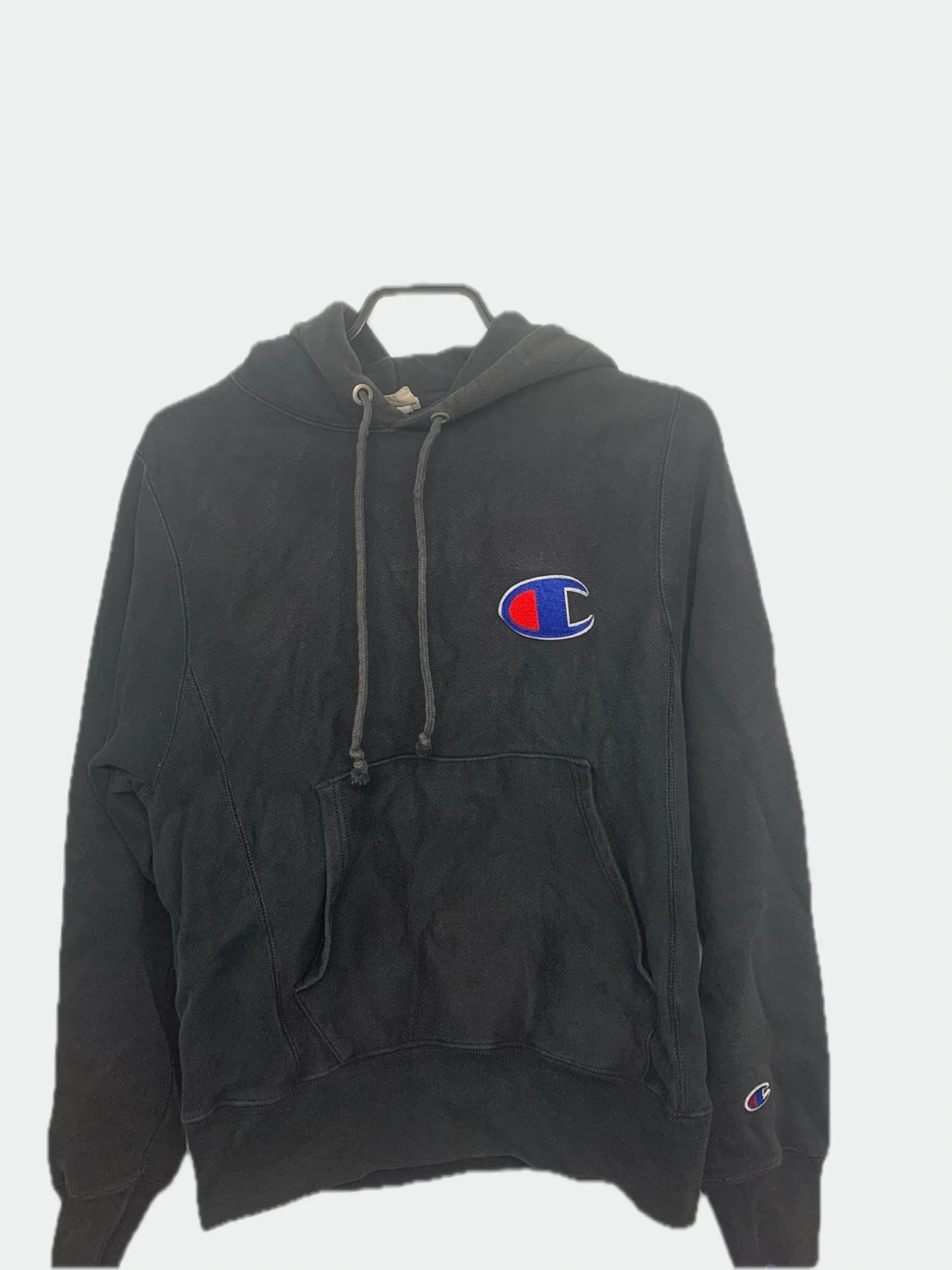 Cozy Champion Reverse Weave hoodie in black! This classic hoodie features the iconic Champion logo on the chest and sleeve. Perfect for staying warm and stylish on chilly days.