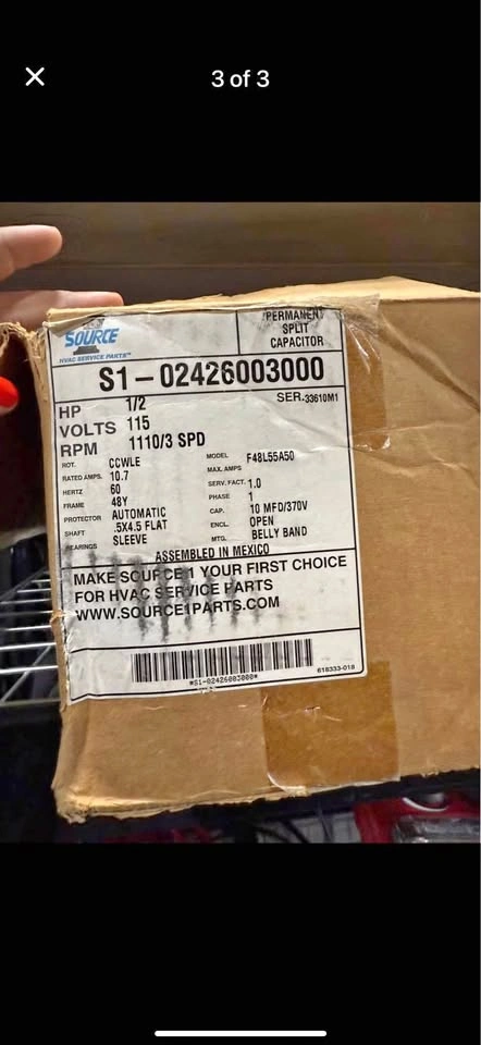 The motor is manufactured by A.O. Smith. The model number on the label appears to be ET-[hidden information]. This type of motor is commonly used in HVAC systems, such as furnaces and air conditioners, to circulate air.