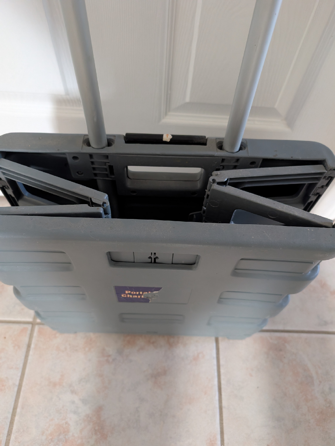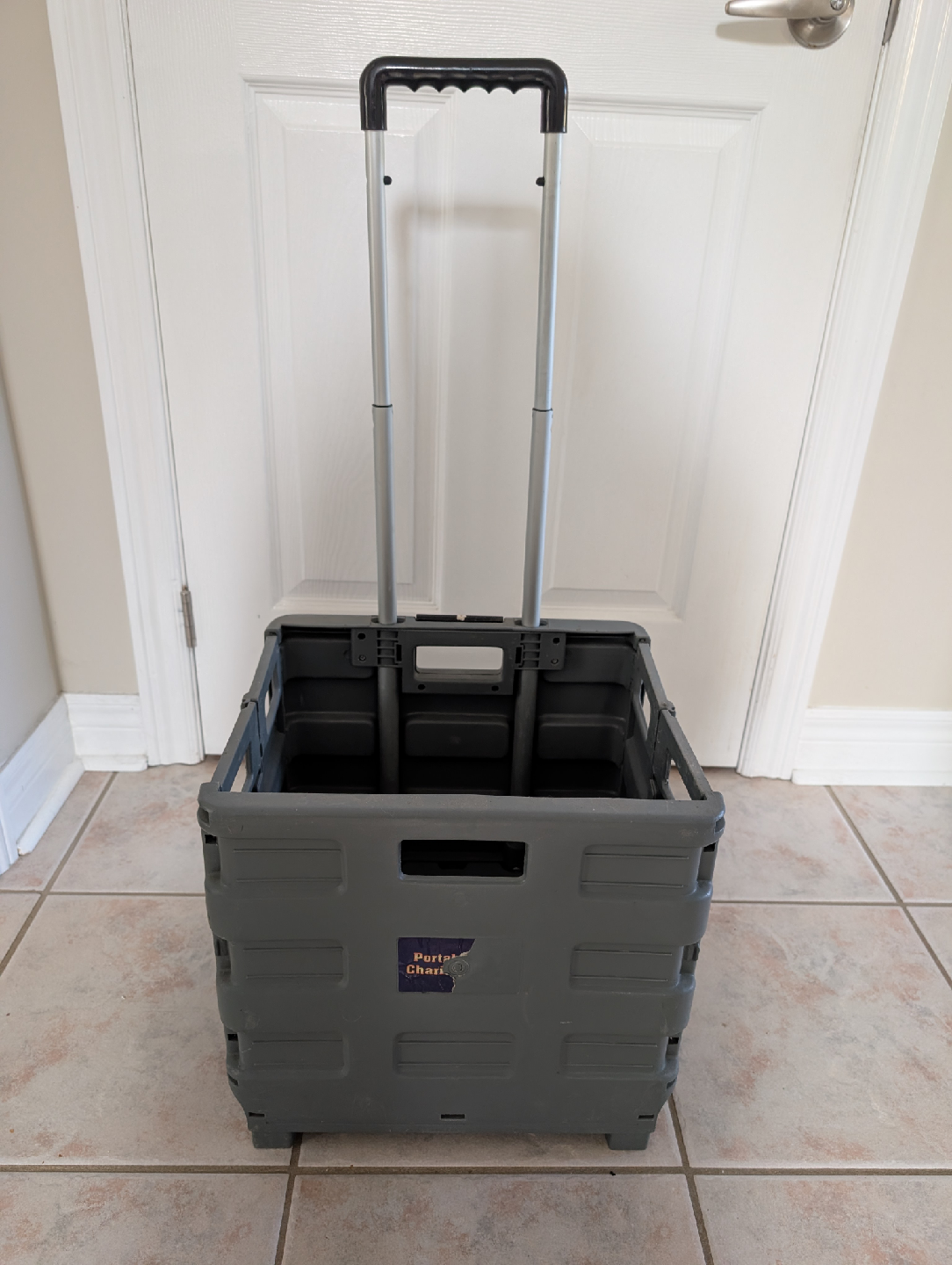 Selling a portable rolling crate. It's in good condition and features a collapsible design for easy storage and a telescoping handle for comfortable use.