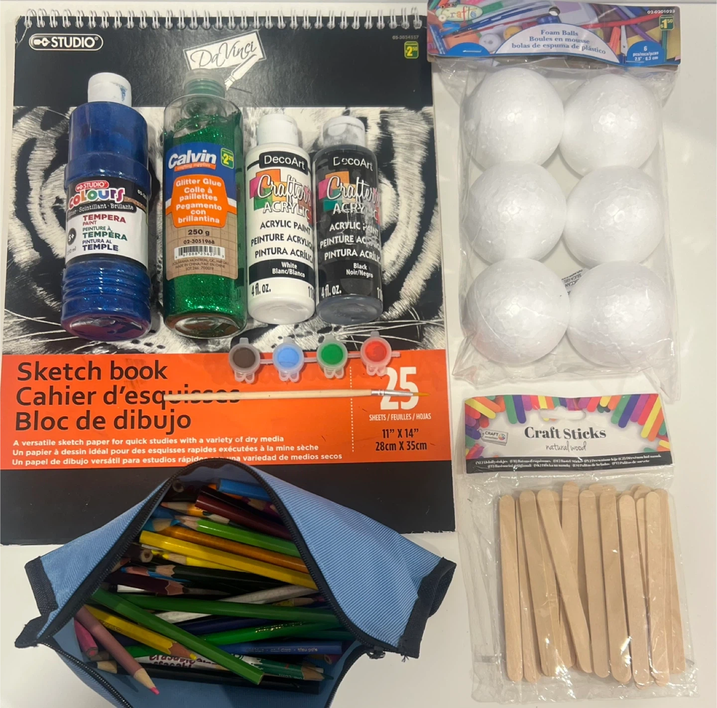 42Includes: Sketch book Hot glue gun & extra glue Large pencil case of pencil crayons Paints/paintbrush Popsicle sticks Styrofoam balls Take all for $10