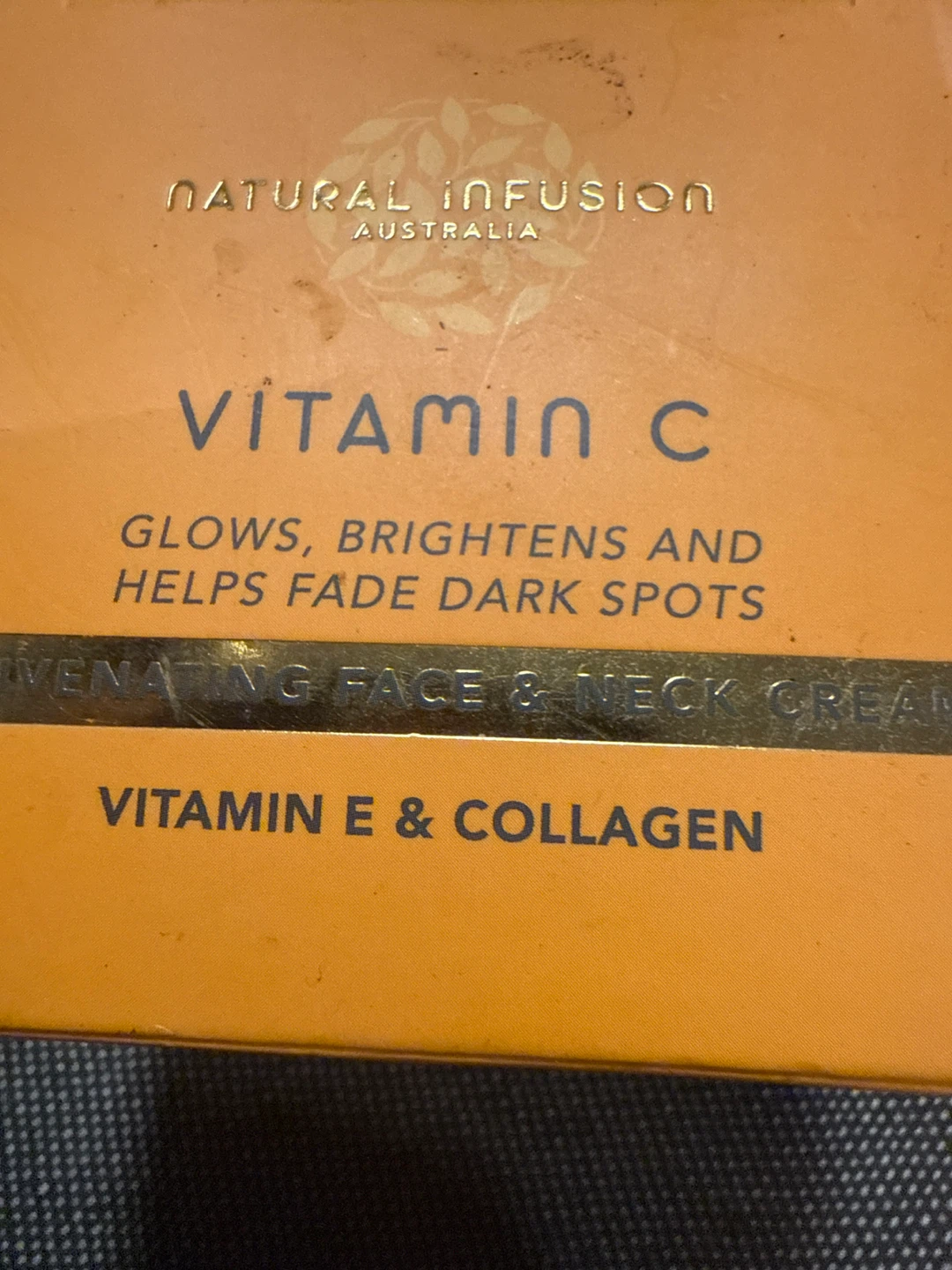 I'm selling a Natural Infusion Vitamin C Rejuvenating Face & Neck Cream. This cream glows, brightens, and helps fade dark spots. It also contains Vitamin E & Collagen. The size is Net 100ml e 3.38 fl oz