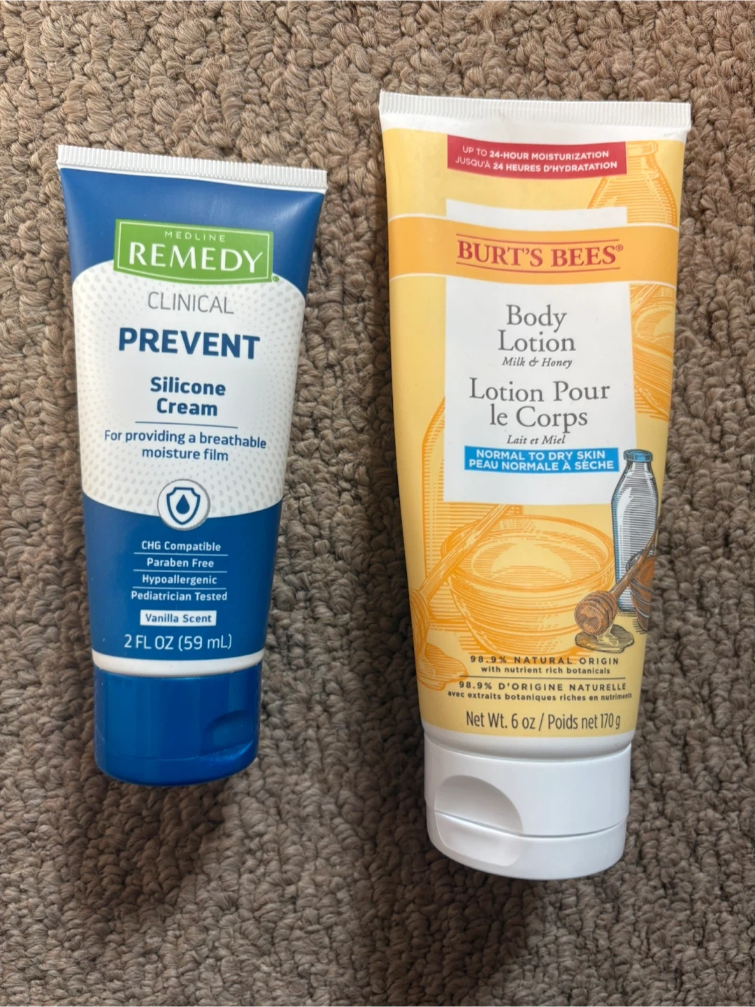 Remedy Clinical Prevent Silicone Cream (2 fl oz/59 mL) and Burt's Bees Body Lotion Milk & Honey (6 oz/170 g). The Remedy cream provides a breathable moisture film and has a vanilla scent. The Burt's Bees lotion is for normal to dry skin and is 98.9% natural origin.