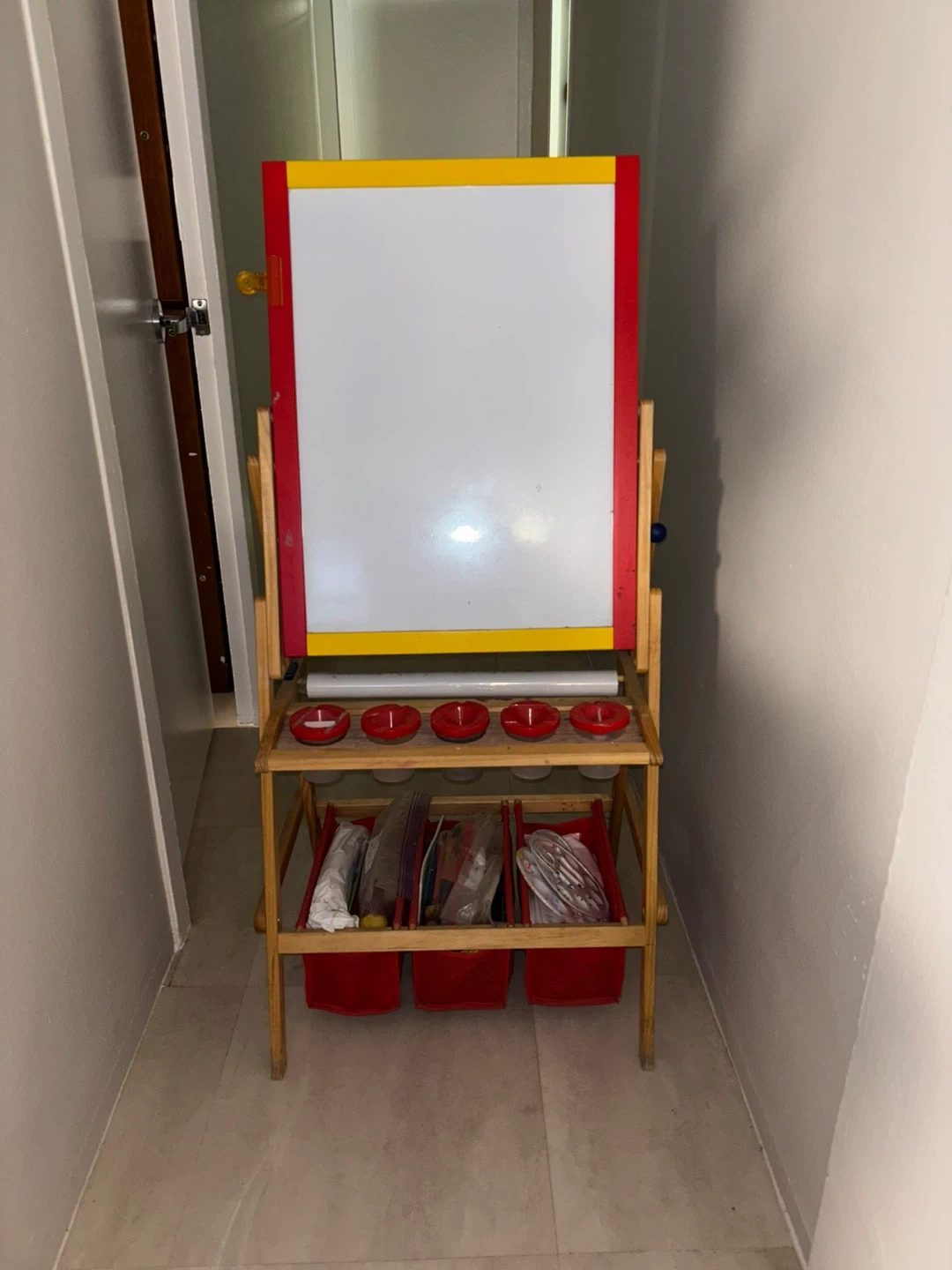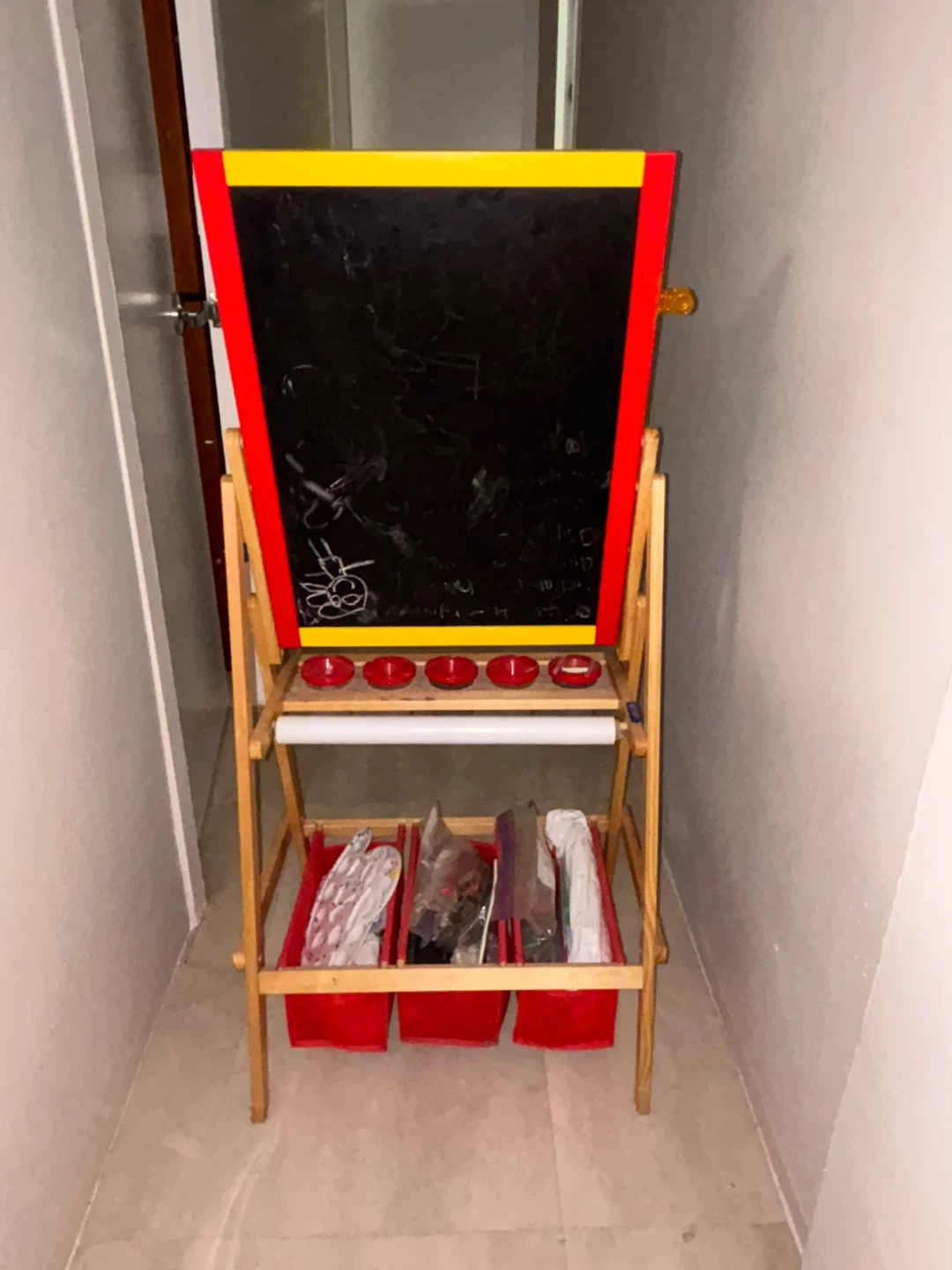 Selling a kids' easel that's perfect for creative play! It features a whiteboard on one side and a chalkboard on the other. There's also convenient storage underneath for art supplies. (Supplies not included) (Pick up only)