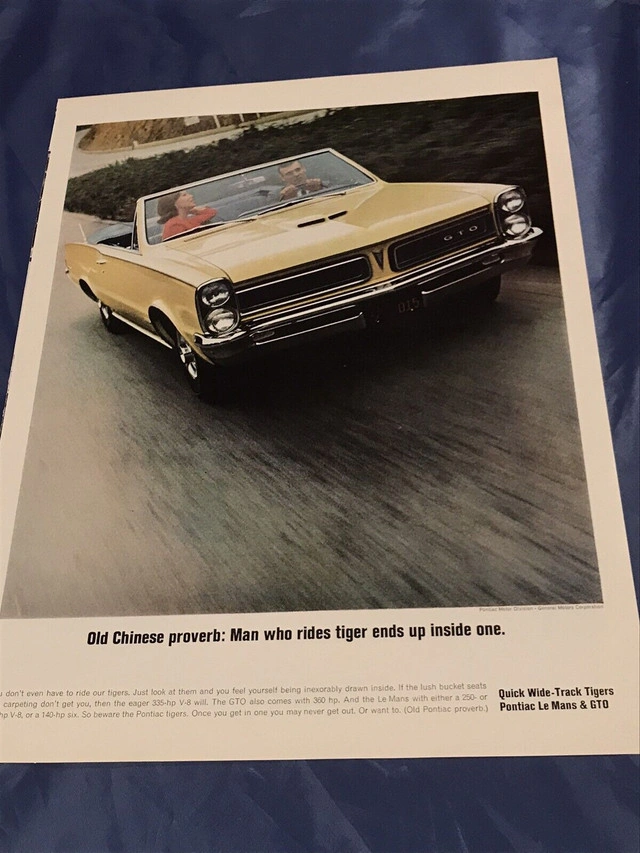 Buy & Sell1965 Pontiac GTO Convertible Original Ad1965 Pontiac GTO Convertible Original Ad$121965 Pontiac GTO Convertible Original Magazine Ad Old Chinese Proverb: Man who rides tiger ends up inside Size: 10" X 13-1/2" More Info: Art0 chats·0 favorites·0 viewsSELLERDaleCrossfield100 reviewsWHERE TO MEETCheck Location