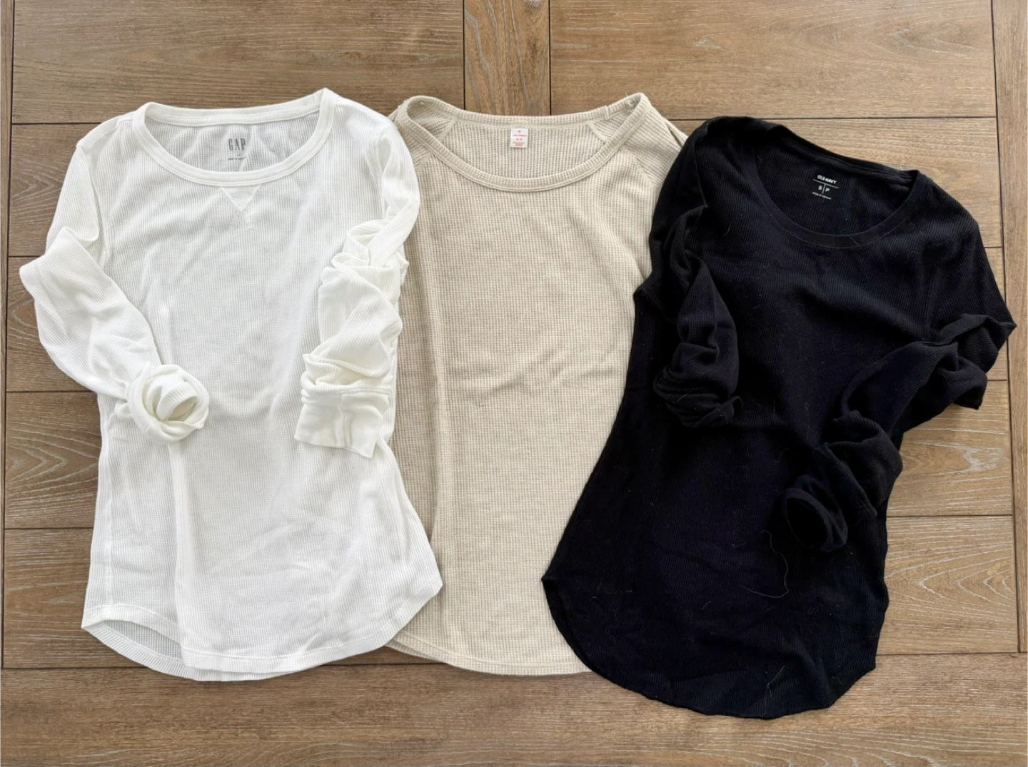 Includes one white Gap shirt, one beige shirt by Joe Fresh and one black Old Navy shirt.