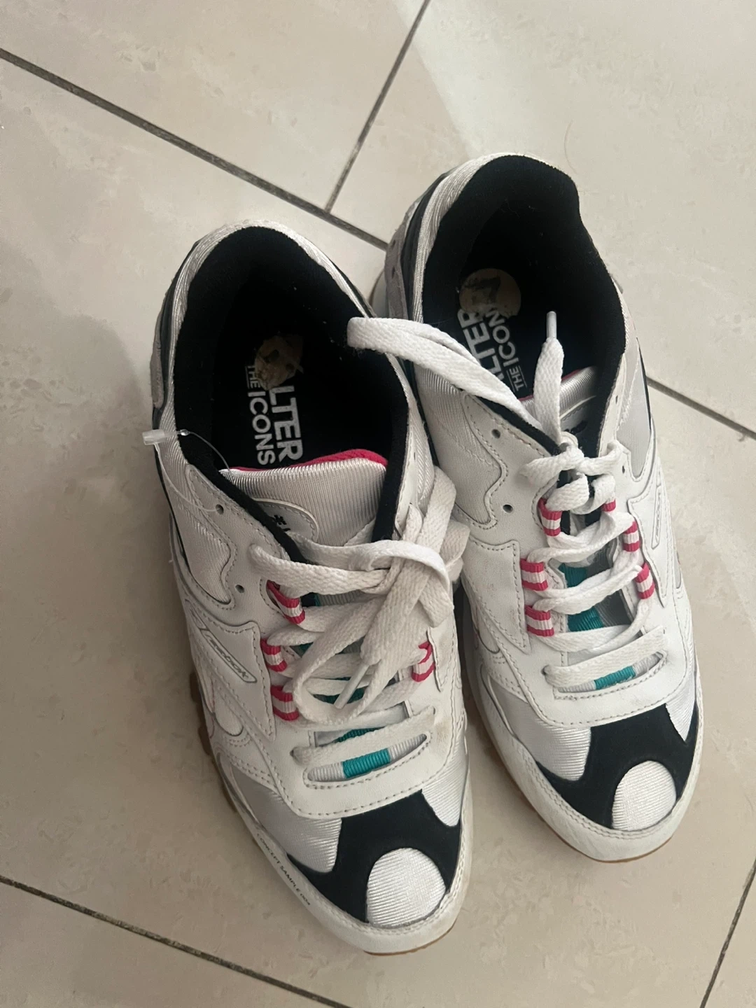 Reebok 119 sneakers in a size 7 USA. These are in excellent condition and ready for a new home! The sneakers are made in Vietnam. They feature a white, black, and teal colour scheme with a gum sole. The size is also listed as 6 1/2 UK, 39 EUR, 25 CM, and 250 MM.
