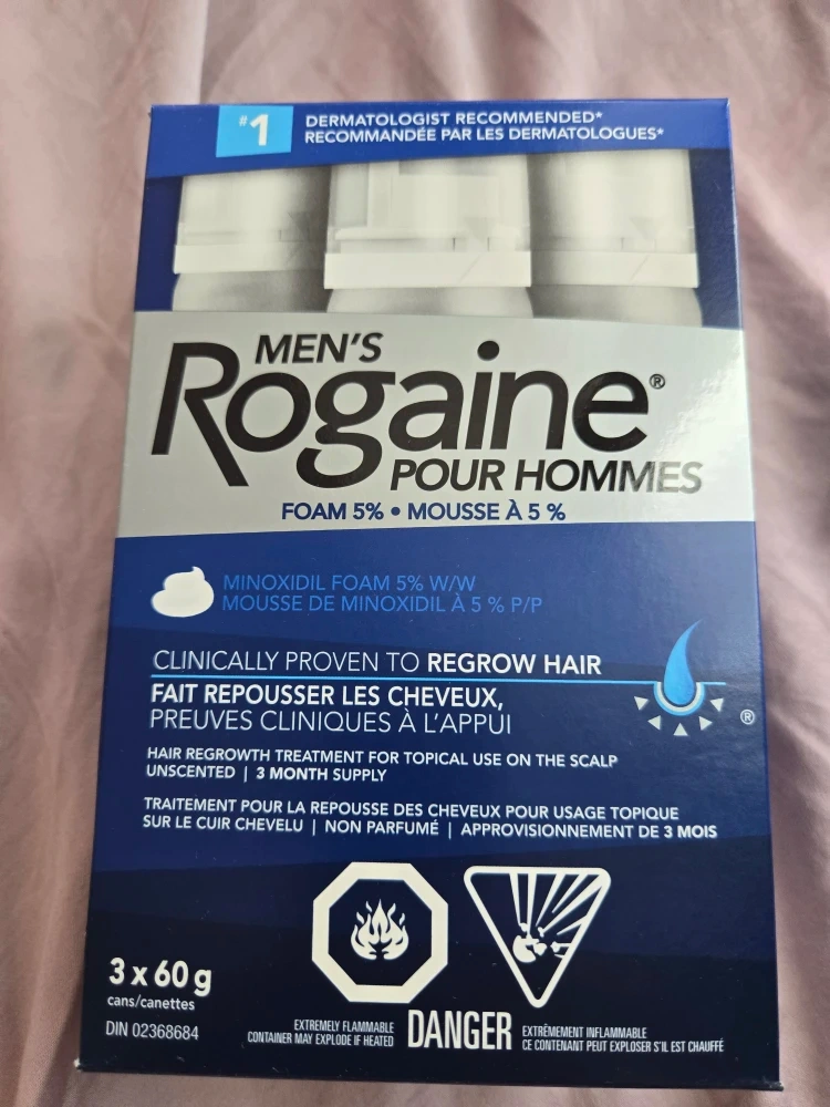Selling a 3-month supply of Men's Rogaine Foam 5%. This hair regrowth treatment is for topical use on the scalp and is unscented. It contains 3 cans, each 60g. Clinically proven to regrow hair!