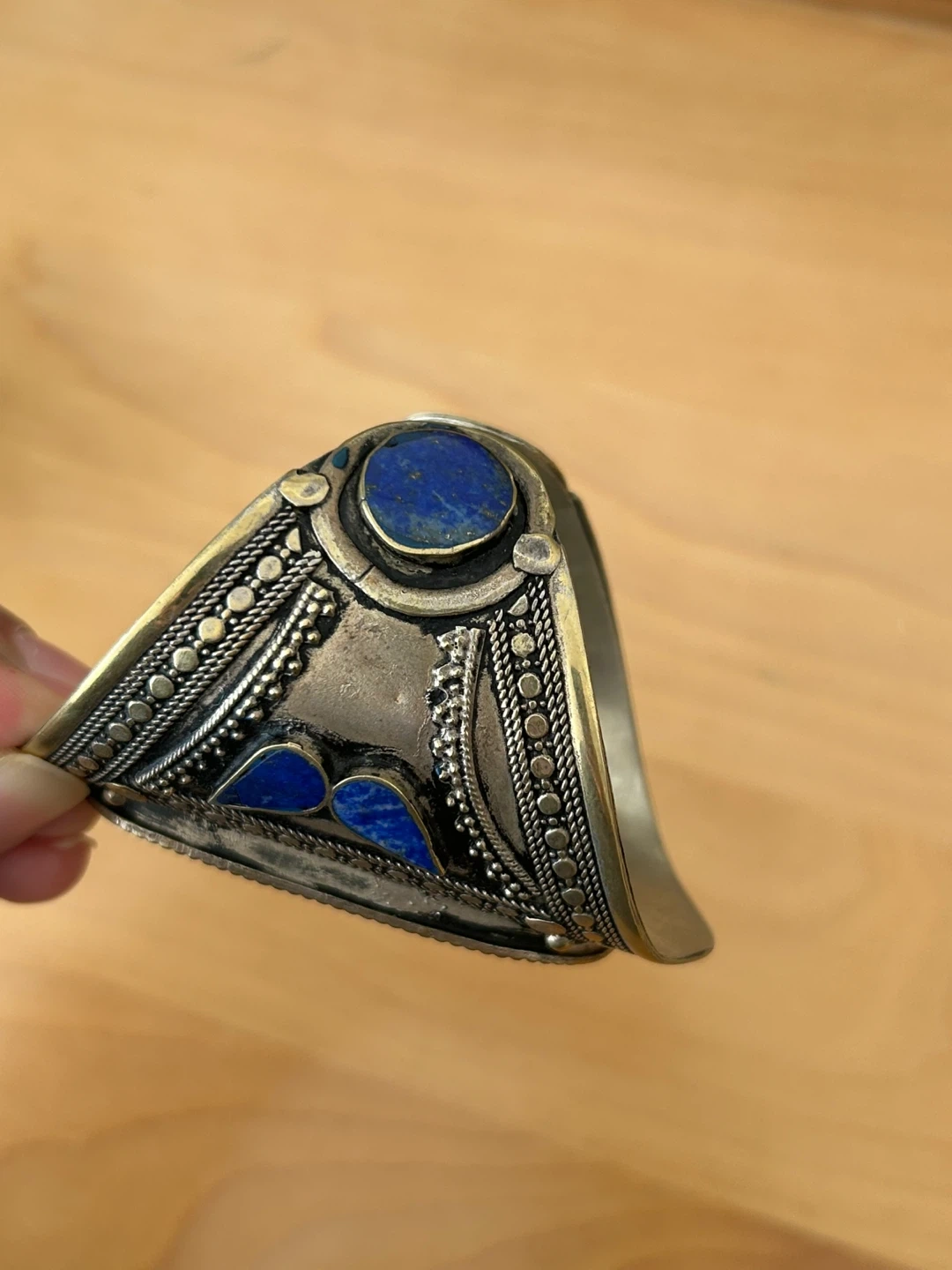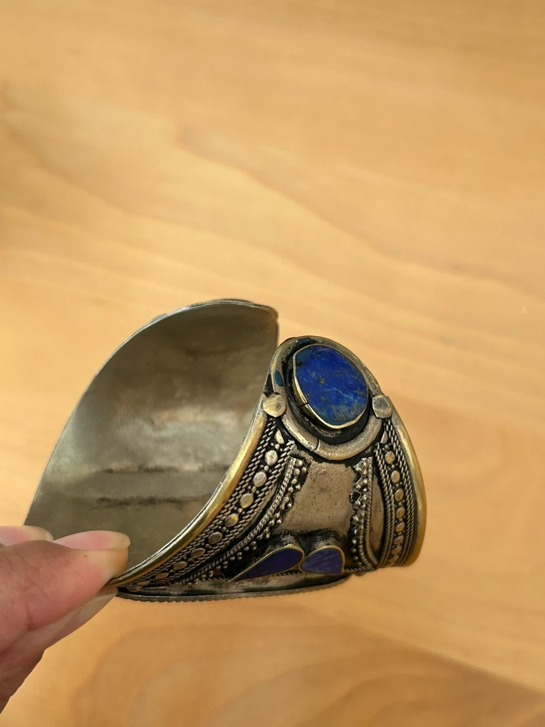346Beautiful vintage cuff bracelet featuring silver metalwork and inlaid lapis lazuli stones. It's a unique piece that would add a touch of bohemian style to any outfit. The metal has a nice patina from age, giving it a truly vintage feel