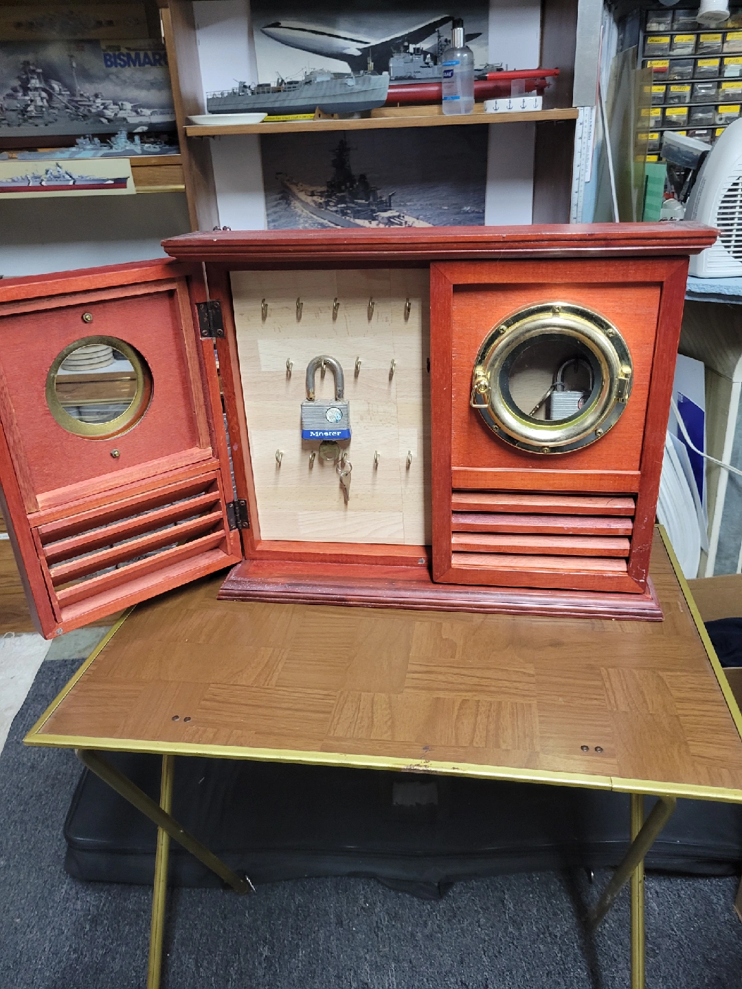 Here's a unique nautical-style wooden key cabinet! It has a lovely wood finish and porthole style windows. Perfect for keeping your keys organized with a bit of maritime flair