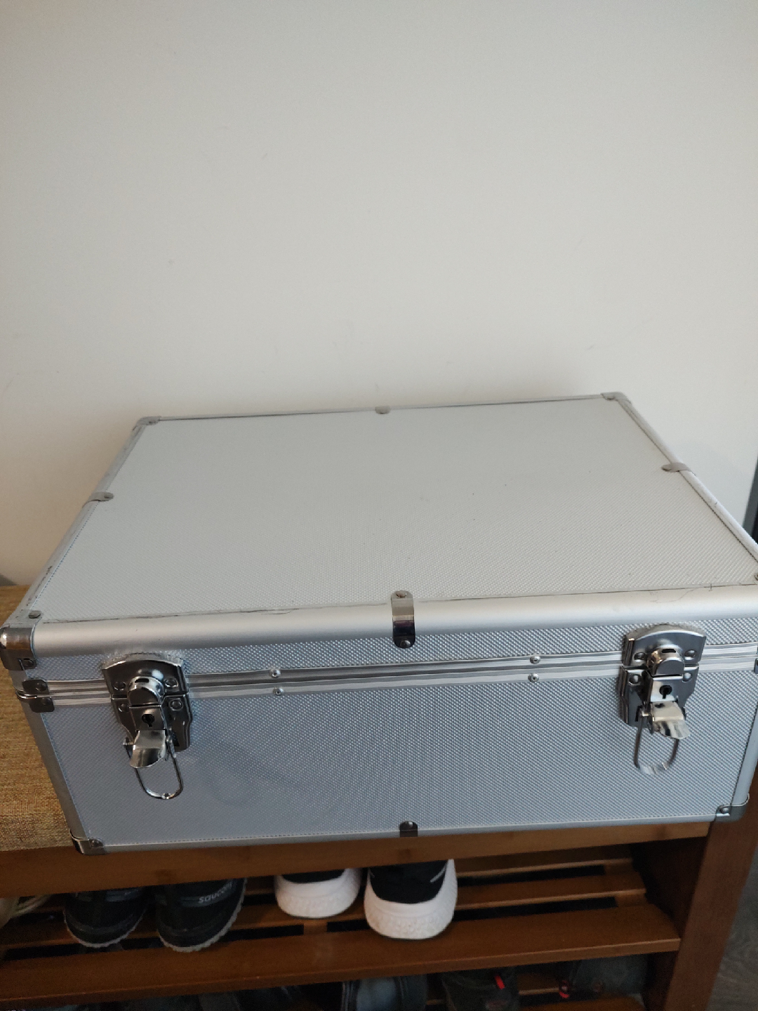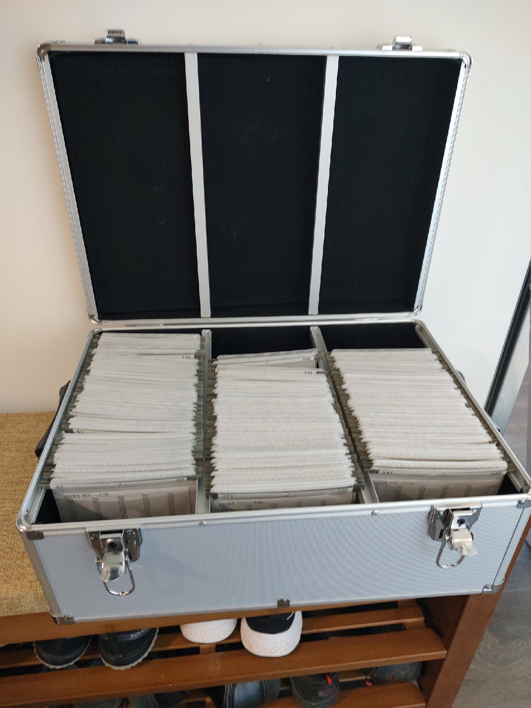 Selling 2 silver and 1 black aluminum storage/carrying cases. Price is for one case. Each can store 510-CD, DVD, Blue Ray discs. A few scratches on top. Metal corners, black side handles, buckle closure, 18.9 x 31 x 20 inches