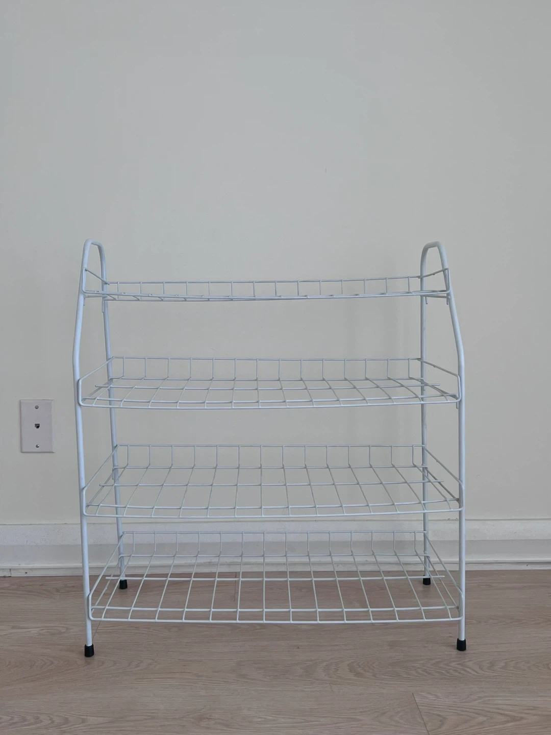 Here's a handy white metal shoe rack with four tiers to keep your footwear organized. It's in great shape and ready to help declutter your entryway or closet