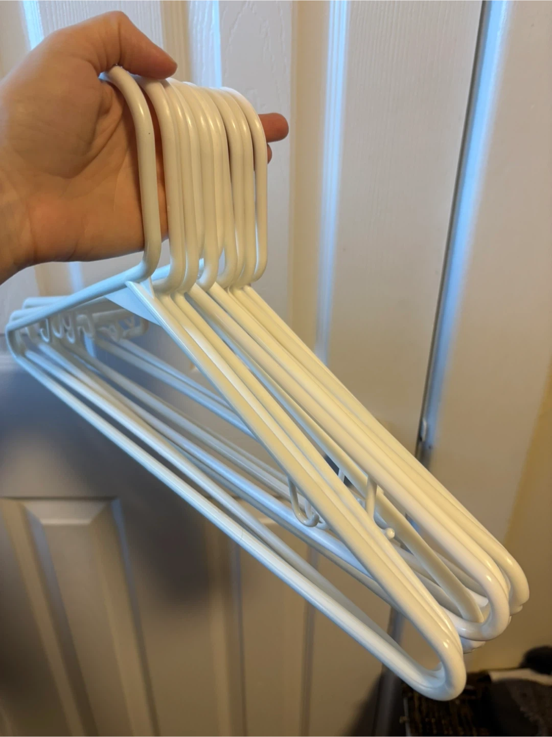 Selling a set of 10 white plastic clothes hangers. They're in great shape, sturdy and ready to help organize your closet!