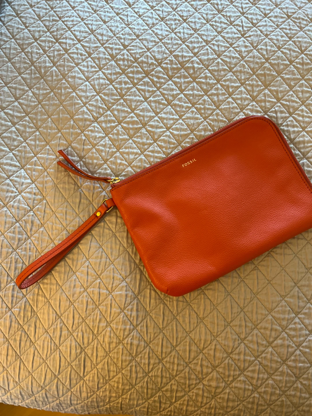 Here's a vibrant orange Fossil wristlet! It's made of leather and has a handy wrist strap. It measures approximately 8 inches in length and 5 inches in height, perfect for carrying your essentials