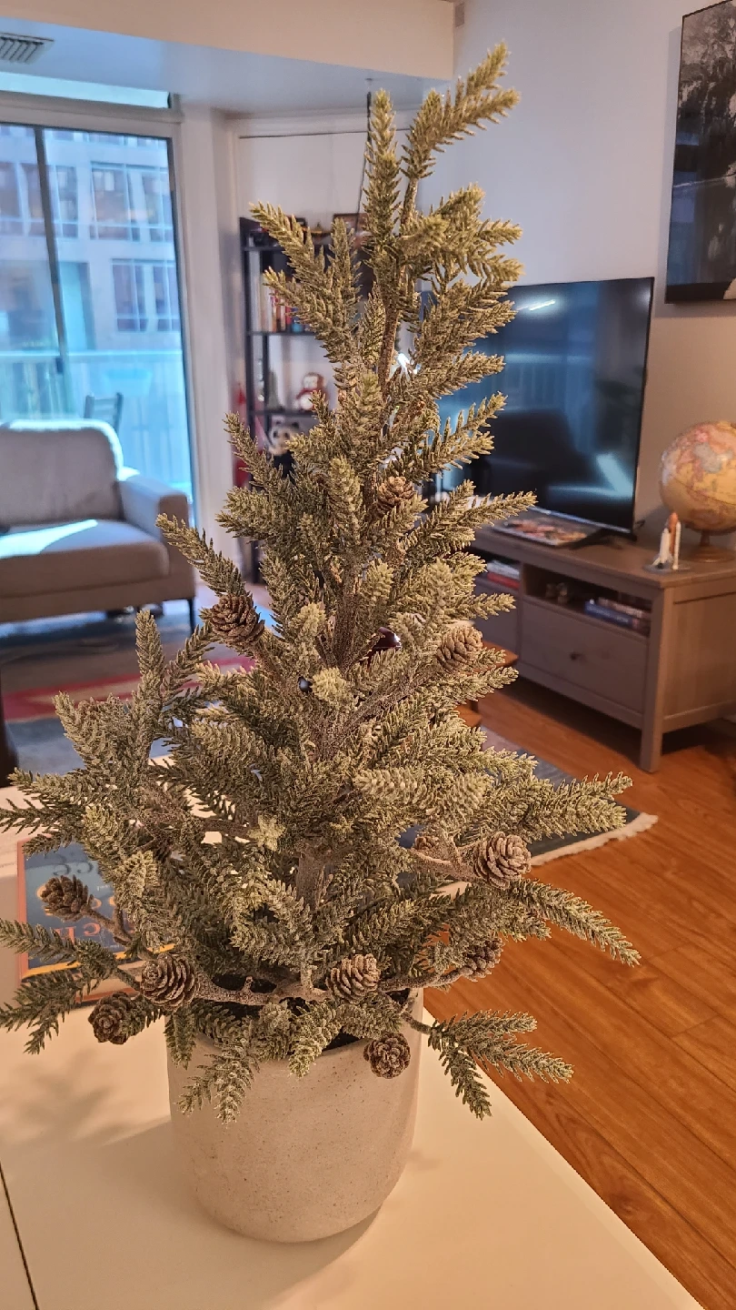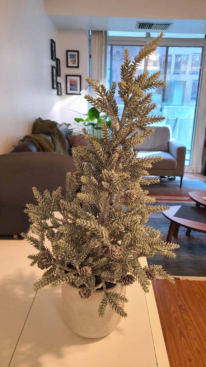 Selling a cute faux Christmas tree in a pot! It's decorated with little pinecones. Perfect for adding a bit of holiday cheer to a small space or as a festive accent piece