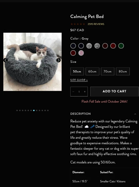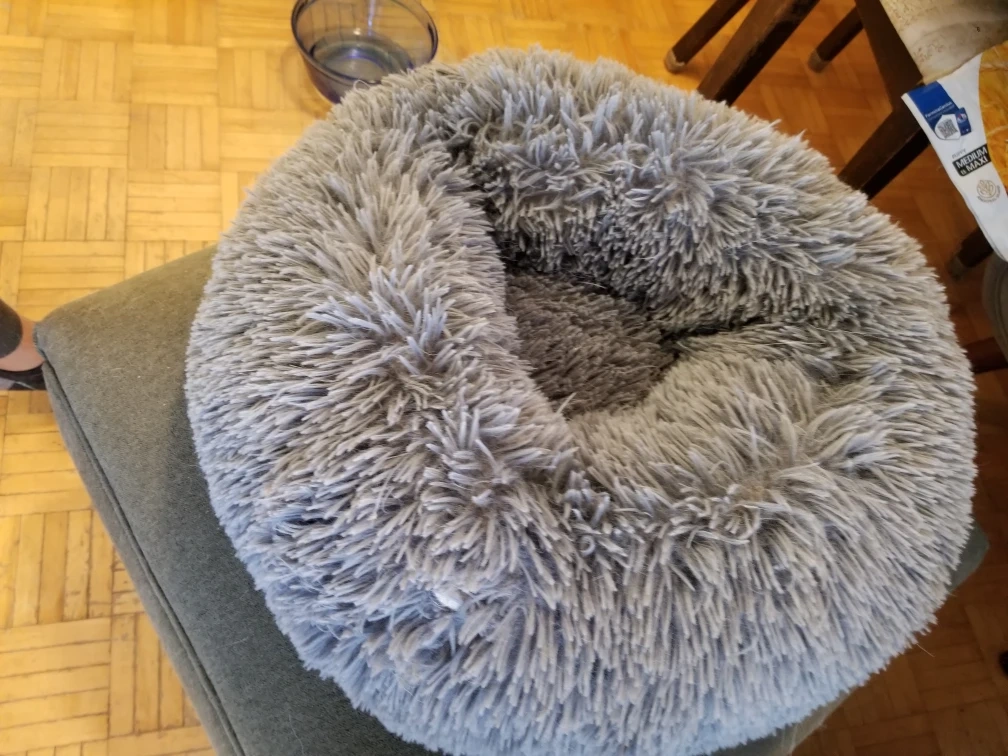Selling a calming pet bed in gray. It's a size 50cm, perfect for smaller cats or kittens. The bed is designed with super soft faux fur and highly effective soothing rims to reduce your pet's anxiety and stress! The diameter is about 50cm / 19.5".