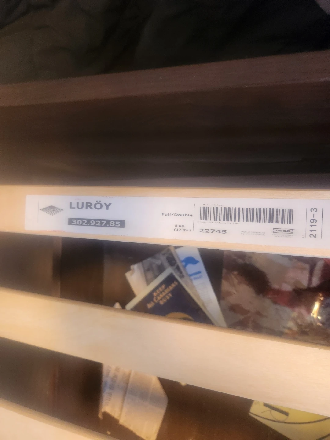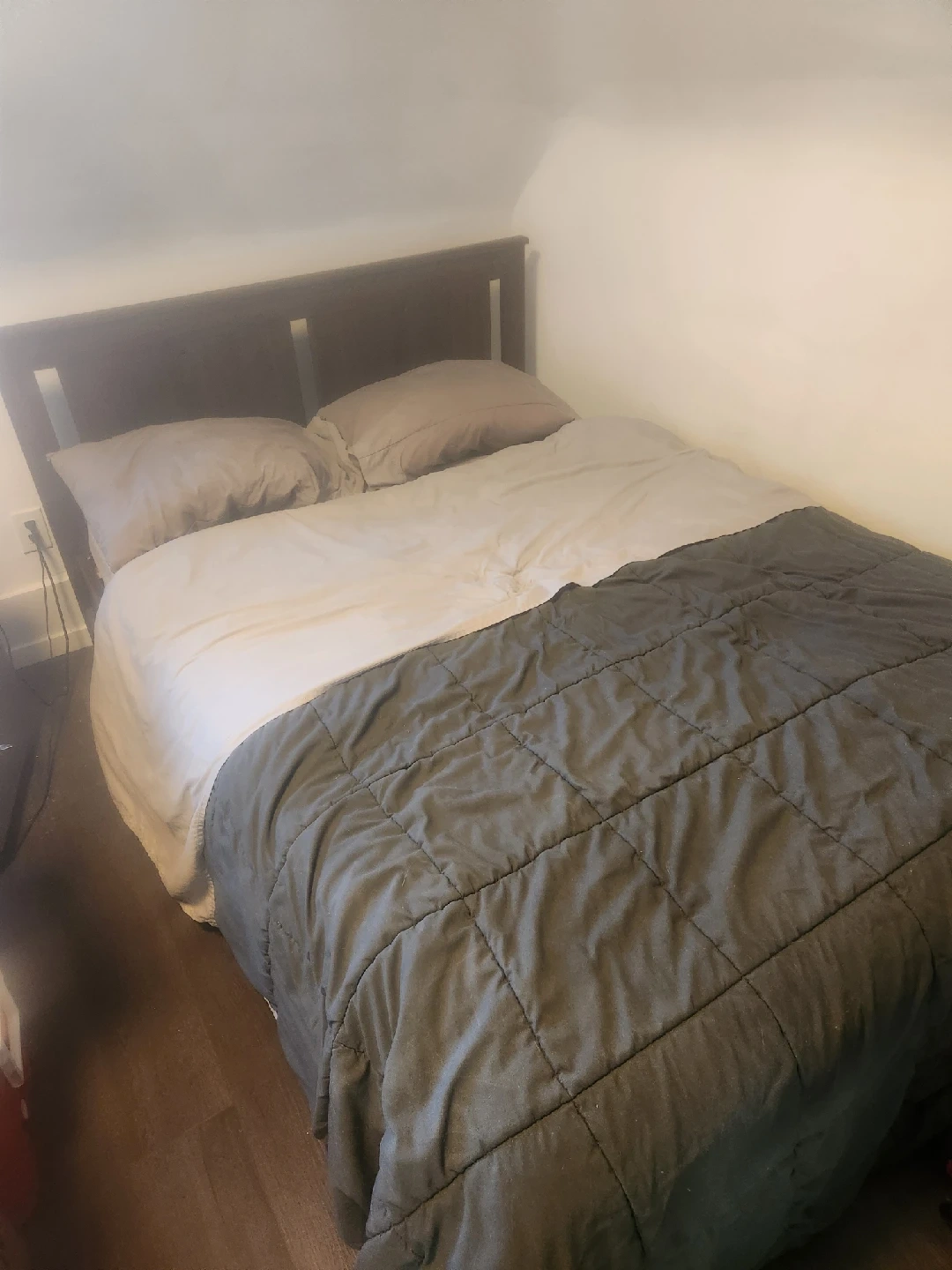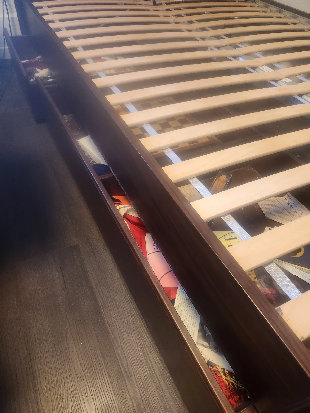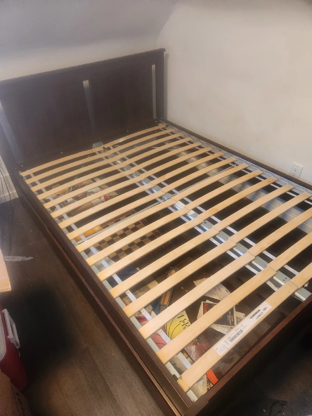 Double (full) size bed frame in excellent, like-new condition, only 4 years old. Solid wood-look frame with two built-in storage drawers underneath. Fits a standard double mattress (54" x 75") and includes wooden slat support – mattress not included.