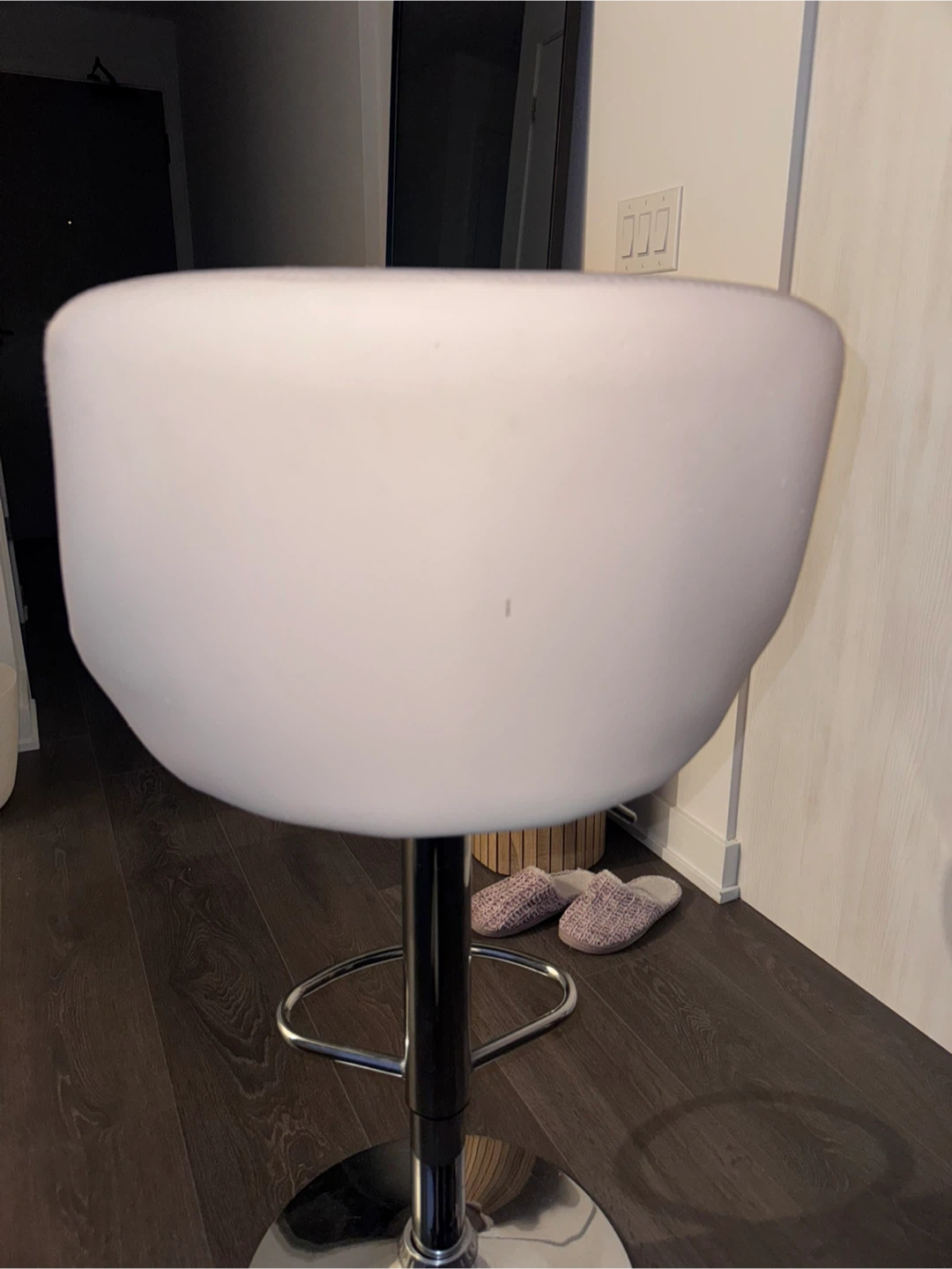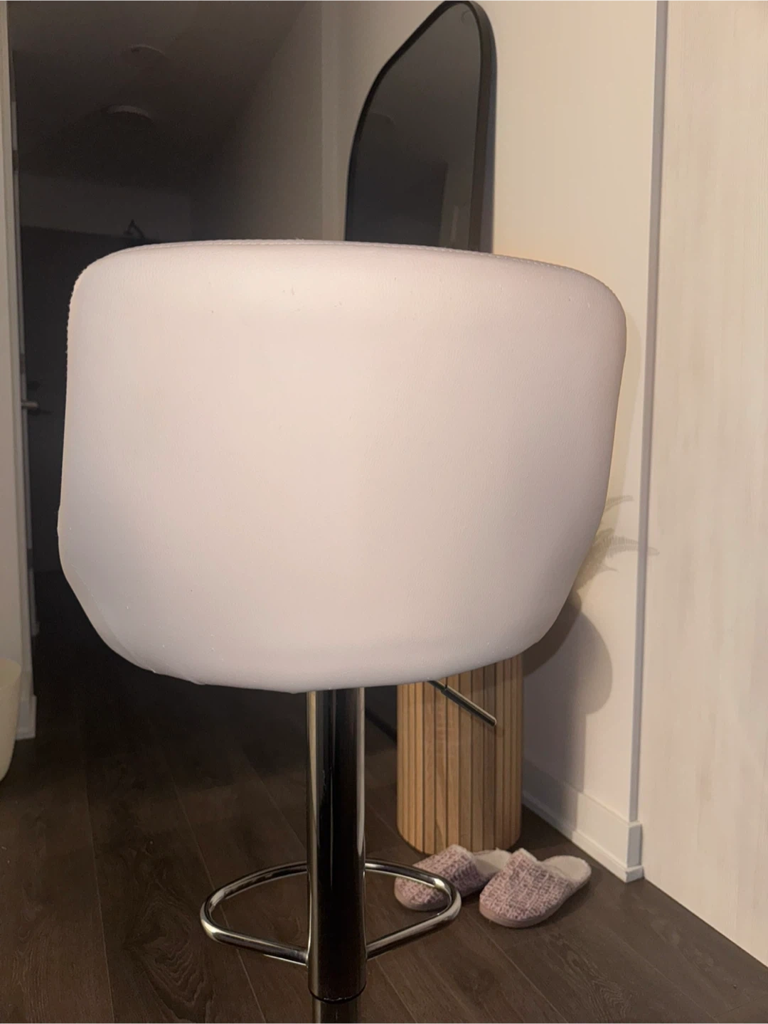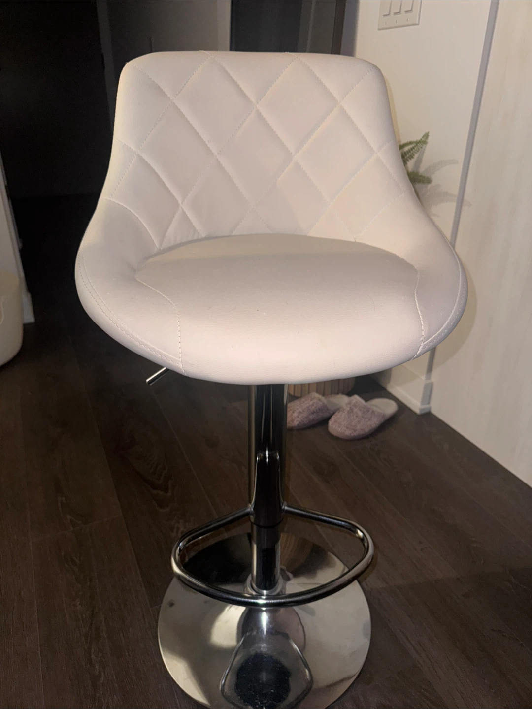 Selling a set of 2 white bar stools with adjustable height. It features a quilted pattern on the seat.