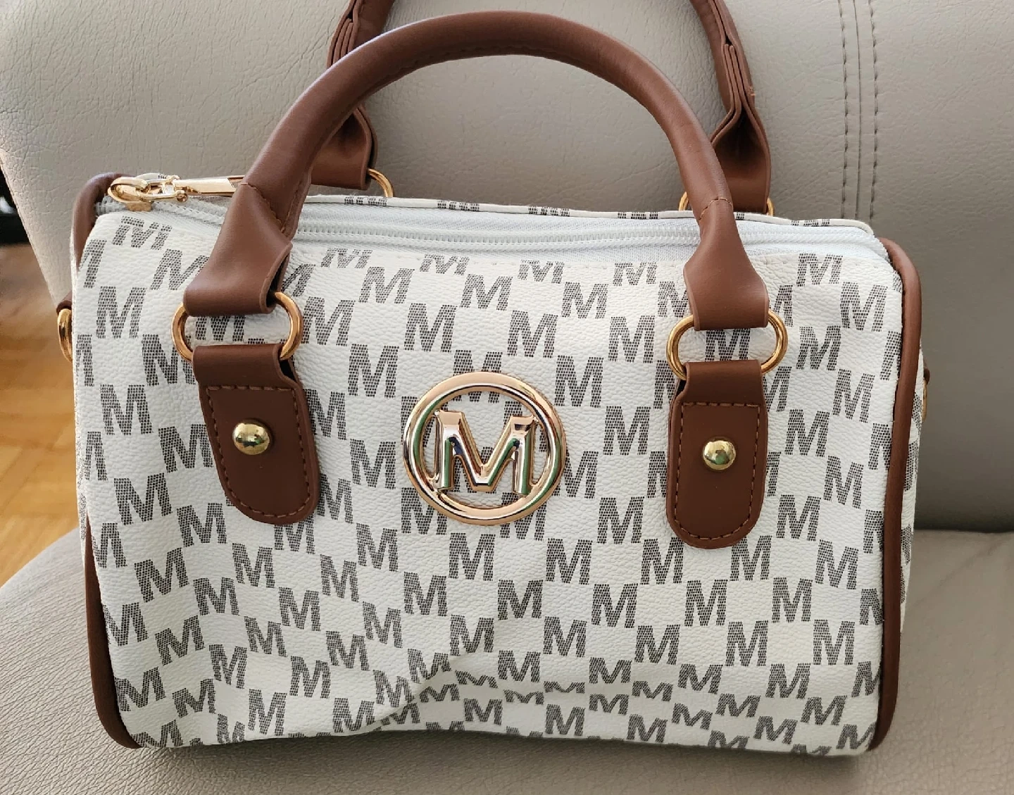Selling a cute handbag with a white background and brown accents! It has an all-over "M" pattern and a circular logo with an "M" in the centre. The handles and trim are a nice brown colour, and it comes with a shoulder strap too