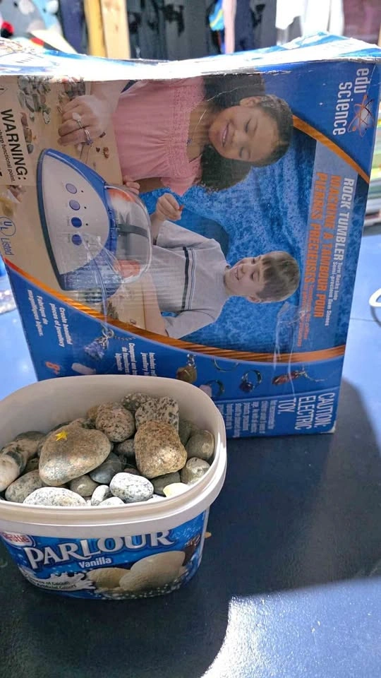 Rock polisher and a tub of rocks plus smaller packets of rocks inside box, everything is inside the box (power cord, instructions, tumbling grits). Selling as I only used this once since it was a big trend as I was younger. $30 as is OBO