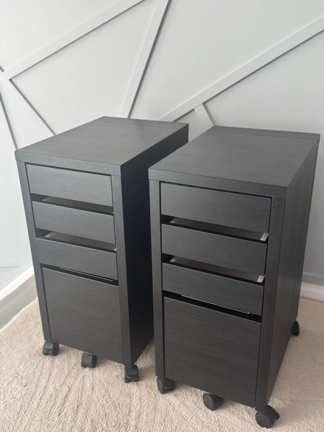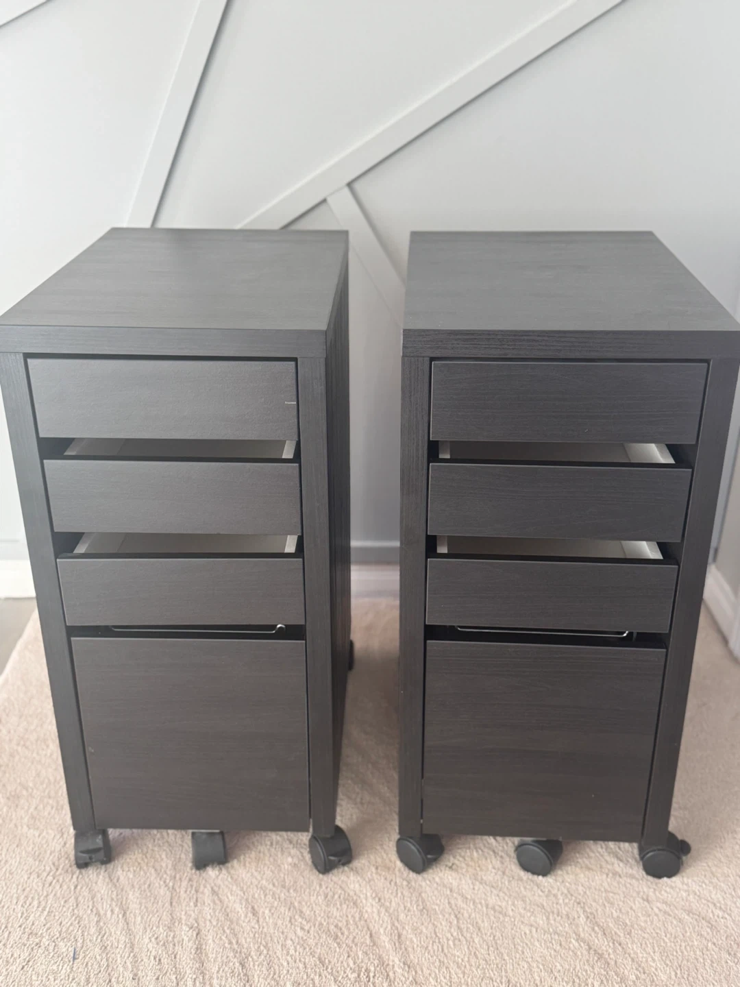5Selling a pair of drawer units on/off casters in black-brown. Perfect for adding some extra storage to your home office, bedroom or any room. They're in great shape and look nice and modern. Pair for $130 Each for $75