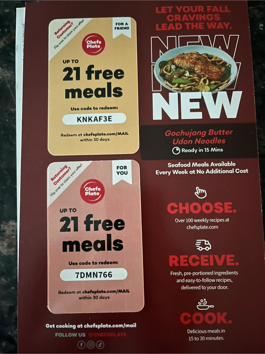 Got a Chefs Plate code for up to 21 free meals! It's a great way to try out their meal delivery service. Redeem the code at chefsplate.com/MAIL within 30 days of activation