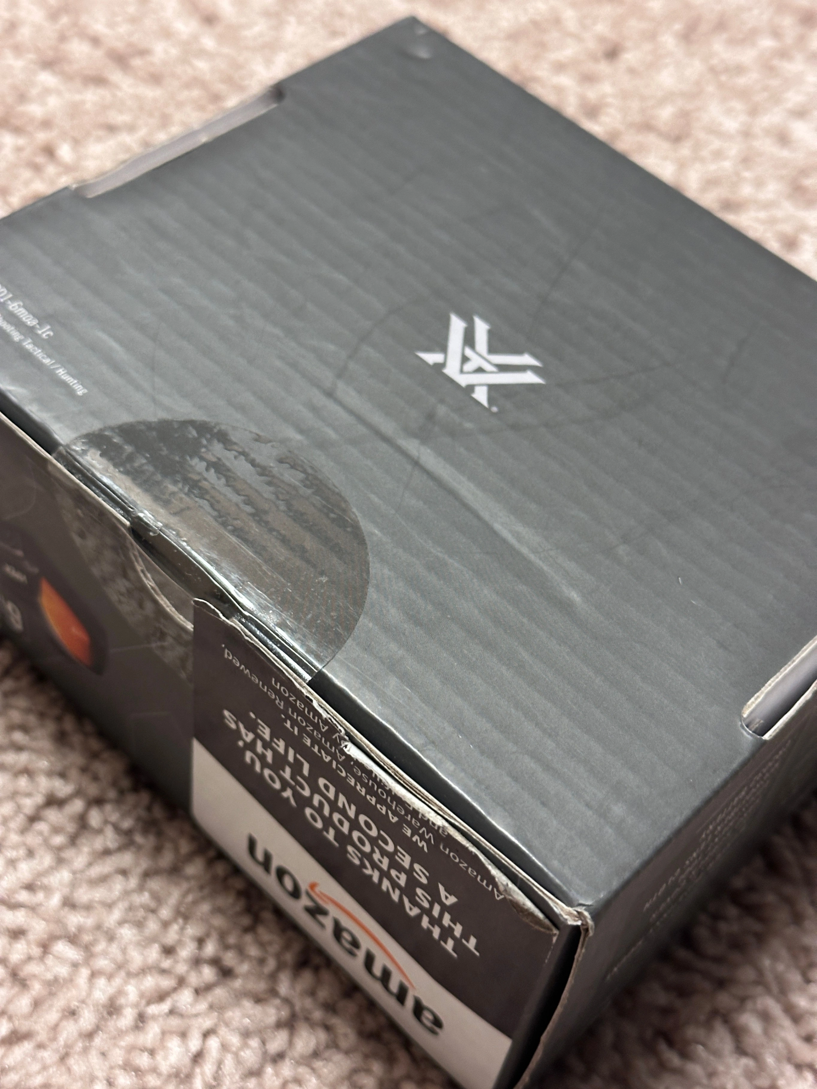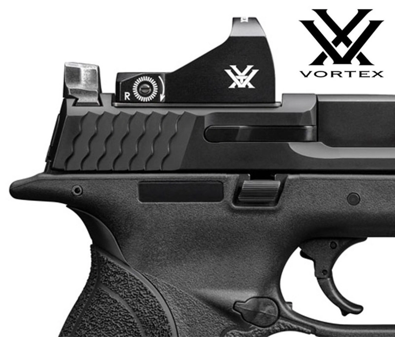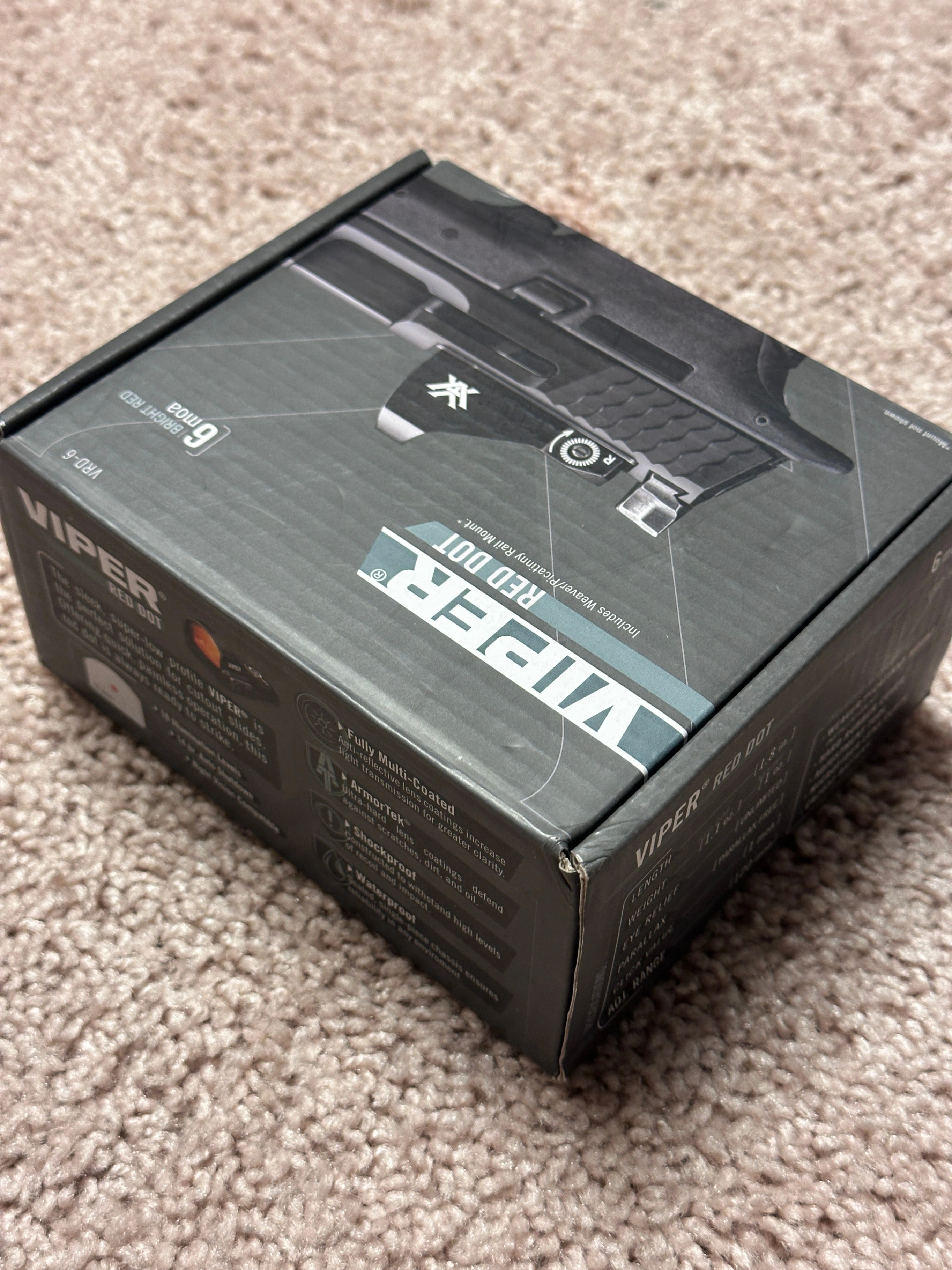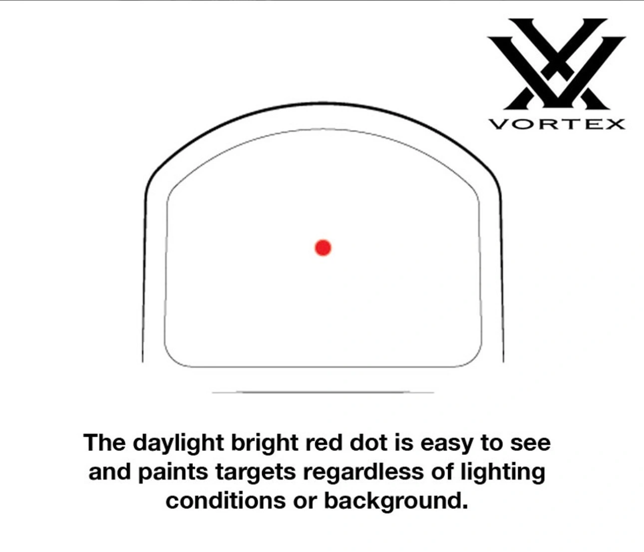 306Vortex Viper Red Dot - 6 MOA [VRD-6] NOTE: NEW Sealed SKU:210000003335 UPC:875874006027 Fully Multi-Coated - Multiple anti-reflective coatings on all air-to-glass surfaces increase light transmission Construction Features: Single-Piece Chassis - Compact and lightweight Waterproof - O-Ring seals prevent moisture, dust and debris from penetrating for reliable performance in all environments Shockproof - Rugged construction withstands recoil and impact Hard Anodized Finish - Highly durable low-glare matte finish Ultra-hard, scratch-resistant coating protects exterior lenses from scratches, oil and dirt Convenience Features: Unlimited Eye Relief - Non-critical eye relief for rapid target acquisition Battery Life - 14-hour auto-shutdown feature maximizes battery life. Up to 150 hours of use at highest setting. Use at the more common lower etstings can allow up to 30,000 hours Compatibility Features: Lug-Screw Footprint Slide Cutout Type: Gl0ck MOS (9mm or .40) - add shim from UM Tact1cal (SHIM-BDS). Use plate #1. Gl0ck MOS (.45 or 10mm) - add shim from UM Tact1cal (SHIM-BDS). Use plate #5. M&P Core - Plate 5 and the "B" screws. FNX-45 - add shim from UM Tact1cal (SHIM-BDS). Use non-Trijicon plate. Hole Spacing Detail Specifications: Magnification: 1x Eye Relief: Unlimited Dot Size: 6 MOA Adjustment Graduation: 1 MOA Max Elevation Adjustment: 120 MOA Max Windage Adjustment: 120 MOA Parallax Setting: Parallax free Length: 1.8" Weight: 1.1 oz. Part #: VRD-6