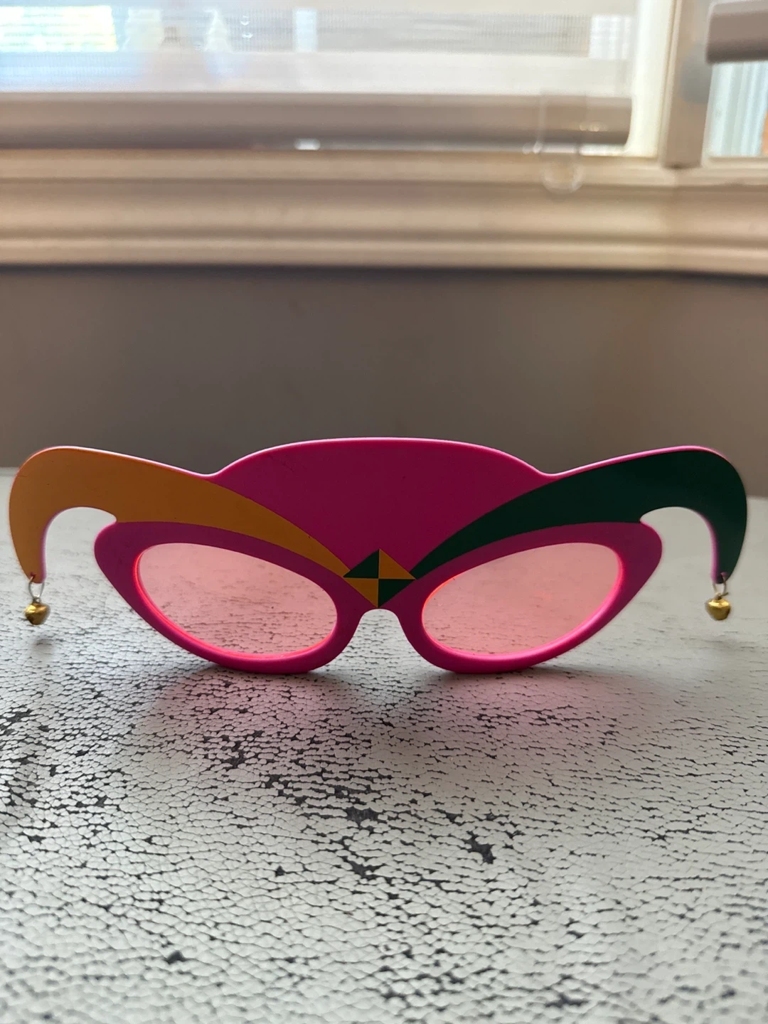 Funky jester glasses ready for a new home! These kid-sized pink glasses feature a unique jester design with orange, green, and gold accents. Perfect for parties or adding a quirky touch to your halloween costume