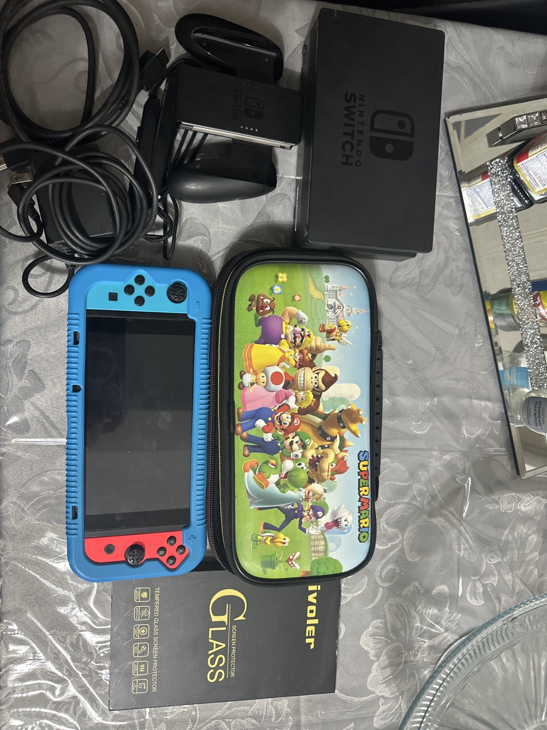 Selling a Nintendo Switch console with a variety of accessories! Includes the dock, cables, and a Super Mario-themed case. Also comes with an iVoler tempered glass screen protector to keep the screen safe and scratch-free reason for selling because i already buy the Nintendo switch 2, item works perfectly fine
