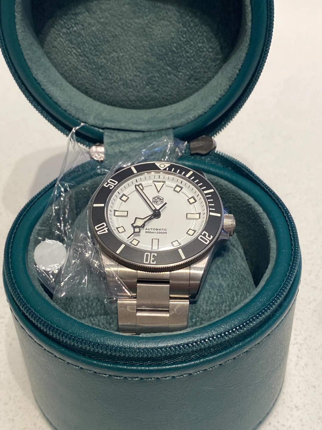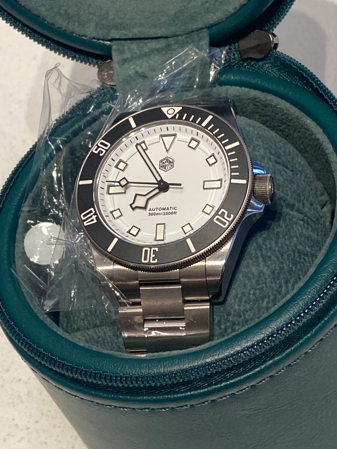 I'm selling a San Martin dive watch, a robust timepiece designed for underwater exploration with its 300m water resistance. It features an automatic movement, ensuring reliability and precision. This watch is in like new condition, carefully handled and well-maintained. The watch also comes with its original case and papers, as shown in the photos.