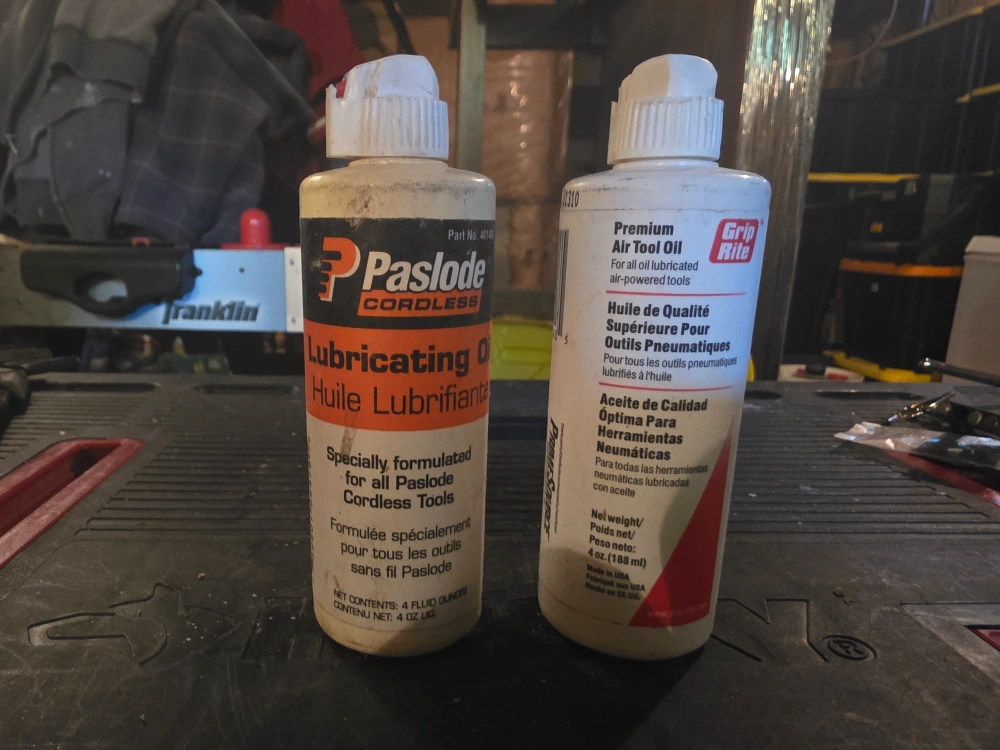 59Selling two bottles of tool oil! One is Paslode Cordless Lubricating Oil, specially formulated for Paslode cordless tools. The other is Grip Rite Premium Air Tool Oil, for all oil lubricated air-powered tools. Both bottles contain 4 fluid ounces. unit 4