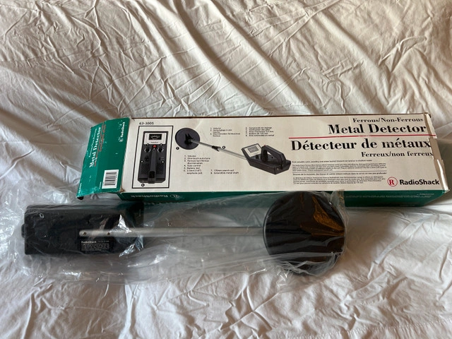 101Unearth hidden treasures with this RadioShack Metal Detector! This Ferrous/Non-Ferrous Metal Detector distinguishes iron or steel from silver and gold with an adjustable sensitivity, volume control, extendible metal shaft and a waterproof search coil. It also features a one-touch auto-tune and a battery test function. It requires 6 AA batteries (not included). This unit is new in its original packaging, ready for its first adventure. Additional features include: * Adjustable sensitivity * Volume control * Extendible metal shaft * Waterproof search coil * One-touch auto-tune * Battery test * Earphone jack * Requires 6 AA batteries (not included) I'm asking $100. If you're reading this, yes, it's still available!