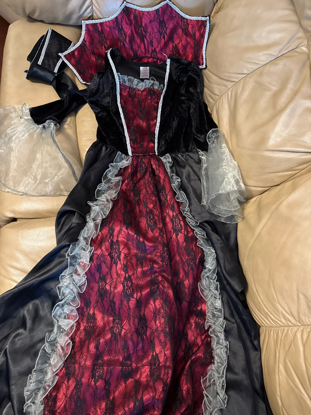 Selling a girls (8-10 years old ) vampire costume dress. It features black velvet and red lace details. Includes the dress, headpiece, and waist tie. Perfect for Halloween or dress-up!