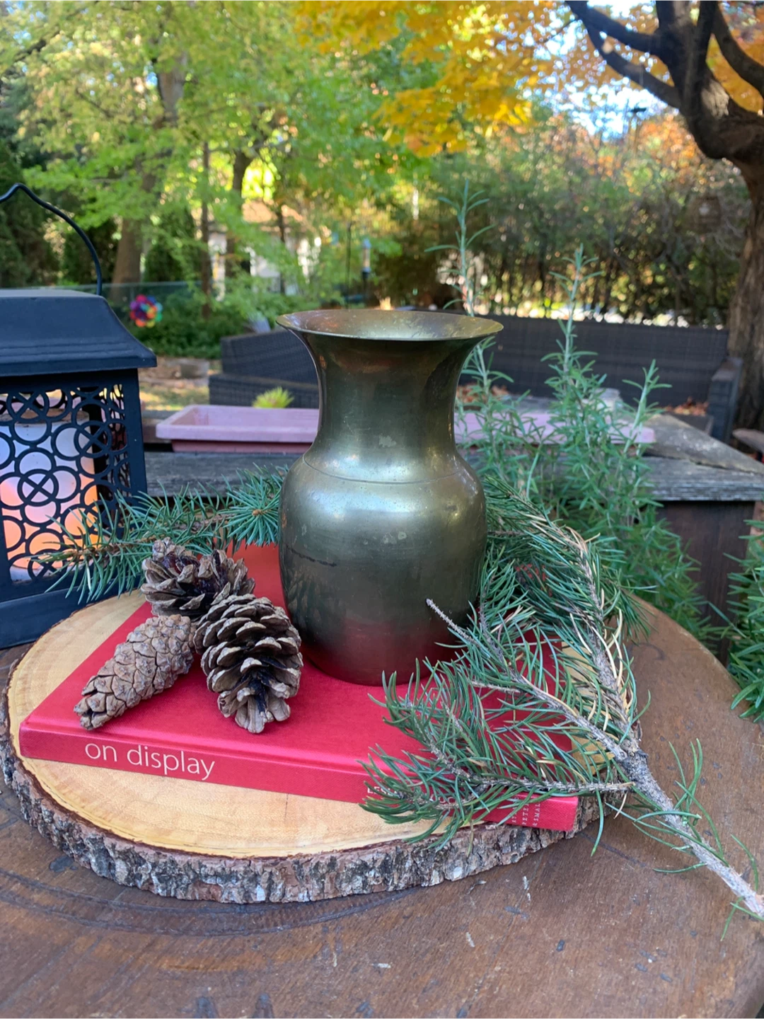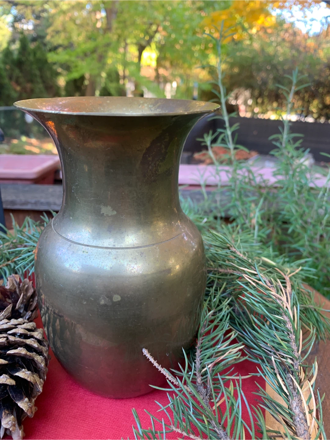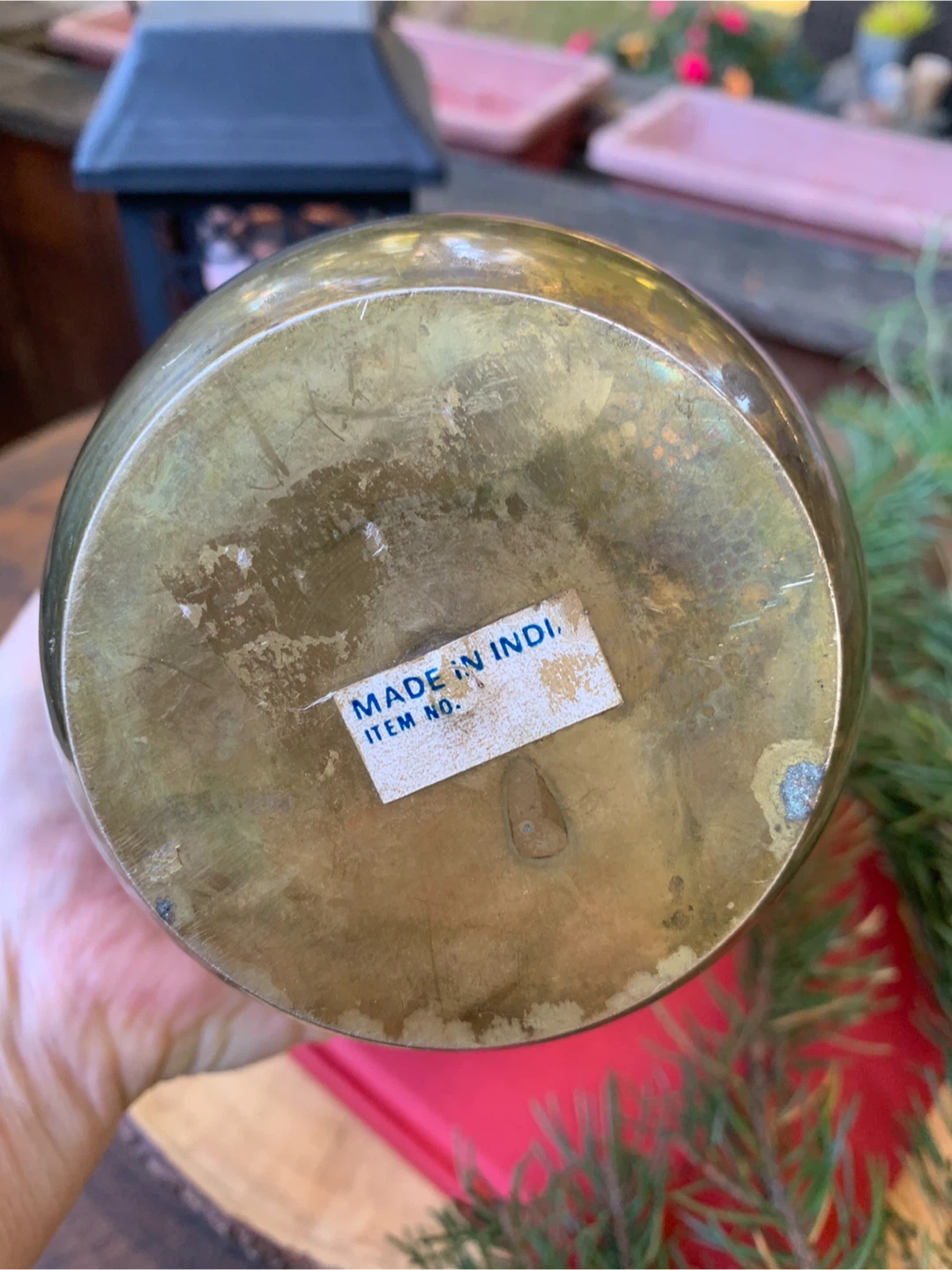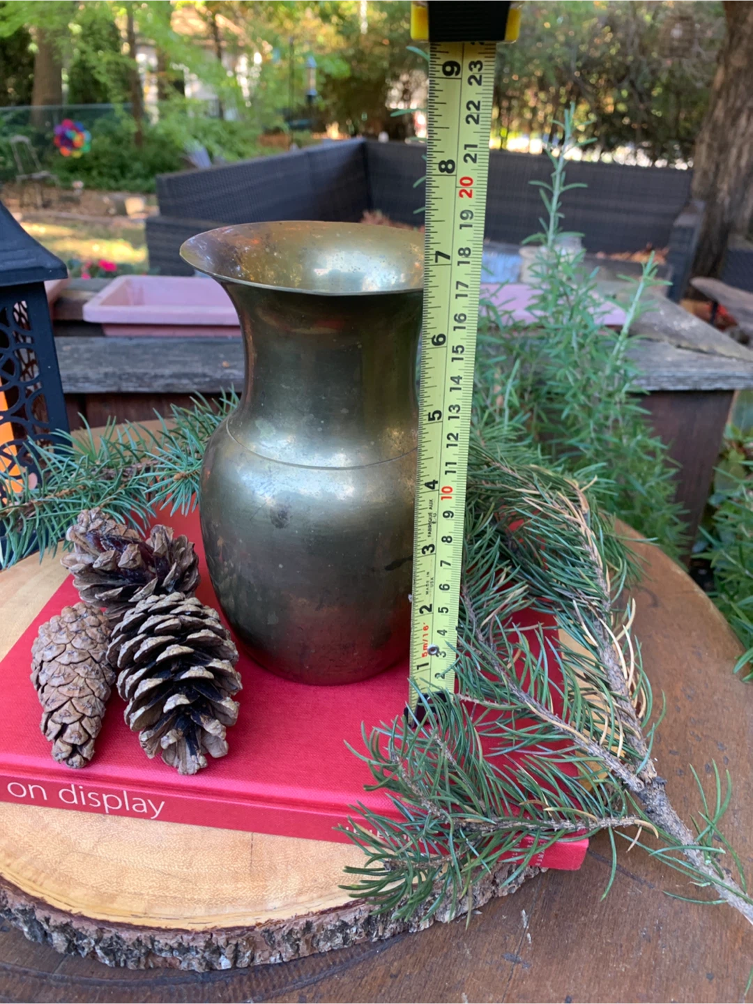Selling a lovely vintage brass vase, marked as 'Made in India' on the bottom. It has a lovely patina and would look great as a decorative piece in your home but is also functional as a flower vase. It has a nice shape to it and looks great stacked on a book. (Book is also available in my listingsš). It is almost 7ā tall and if you donāt like the patina look, you could always polish it.