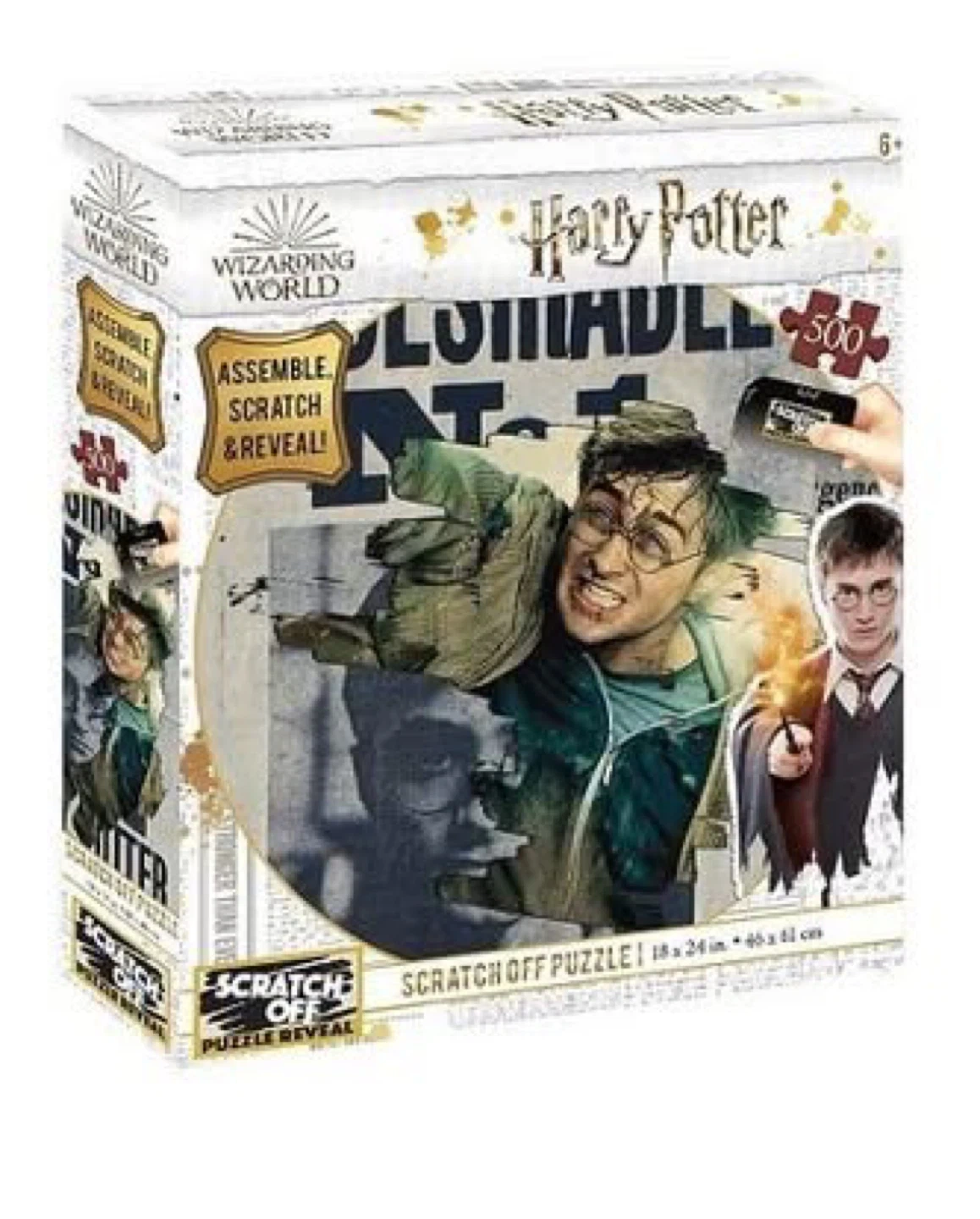 Assemble, scratch, and reveal the Harry Potter Scratch Off Puzzle! This puzzle contains 500 pieces and is suitable for ages 6+! The assembled puzzle measures 18 x 24 in (46 x 61 cm).