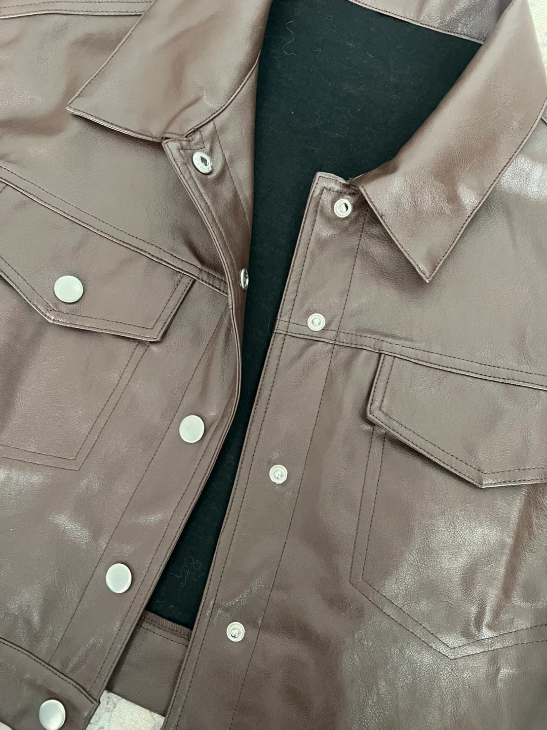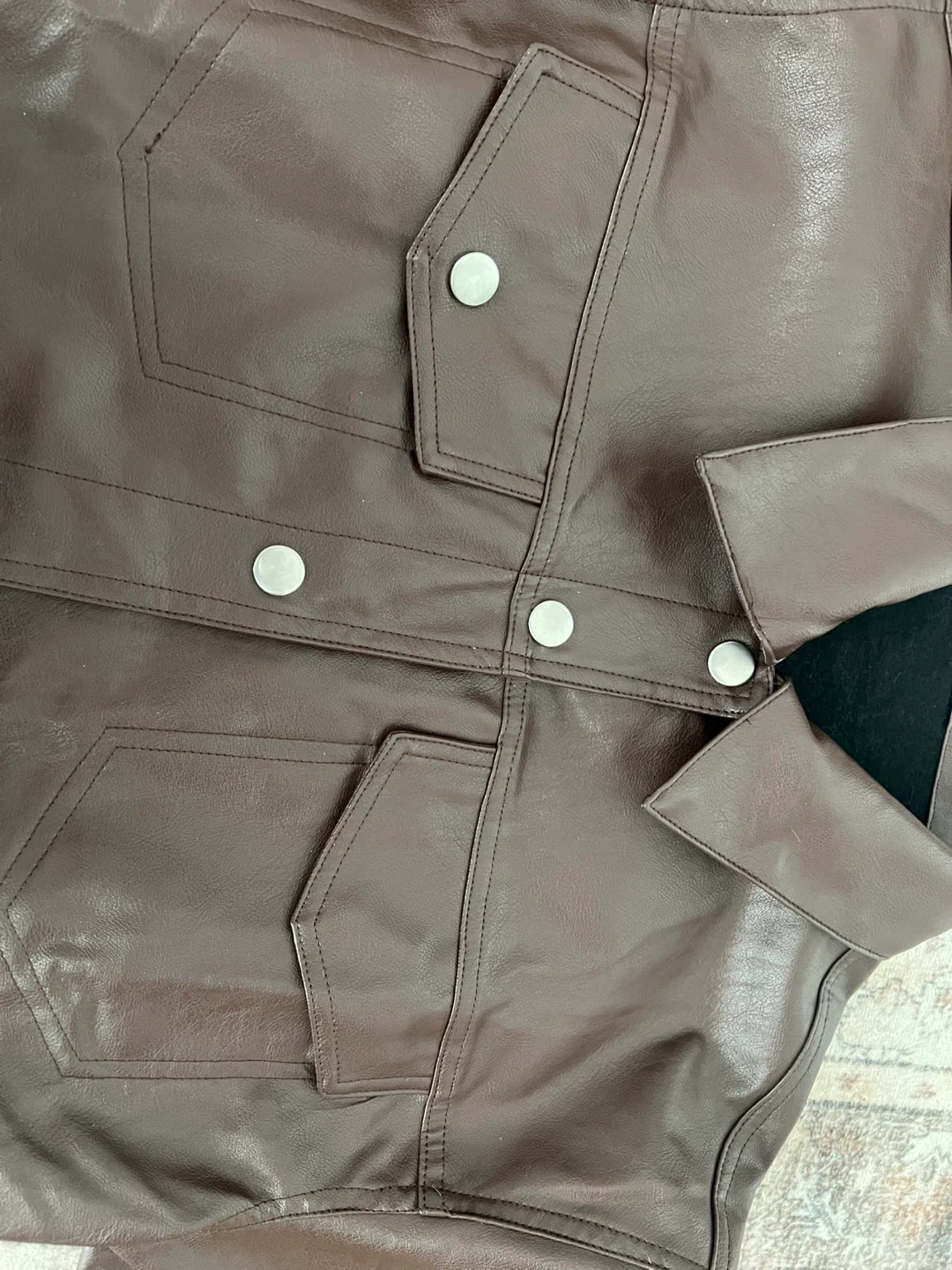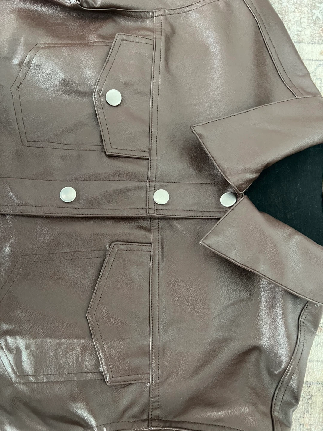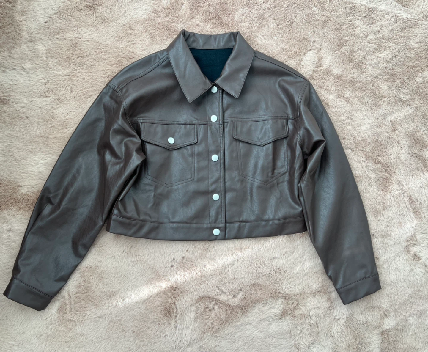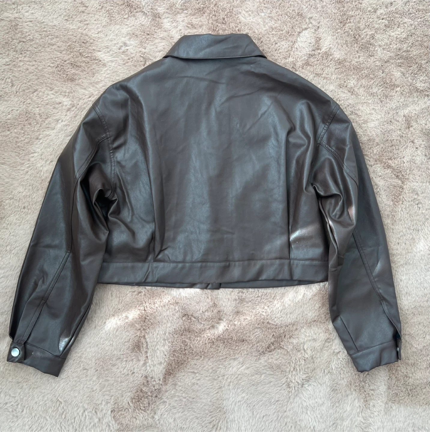 Selling a stylish brown faux leather cropped jacket. It's a great piece for layering and adding a bit of edge to your outfit! The jacket features a collared neckline, and functional pockets. It's in excellent condition and ready for a new home.