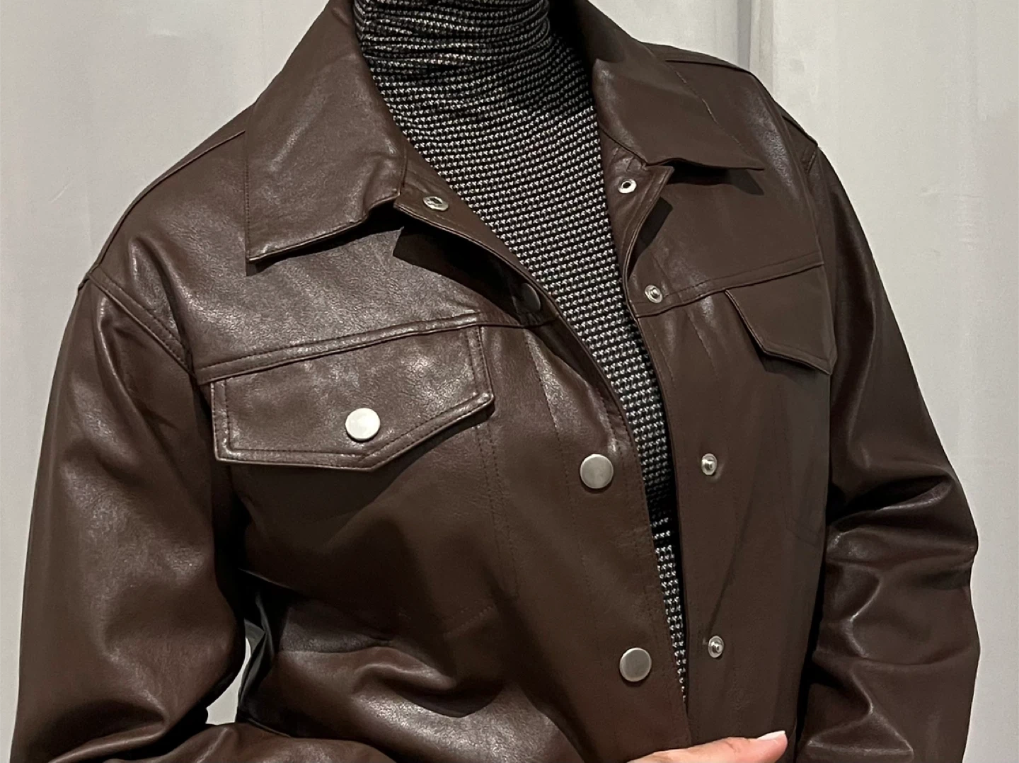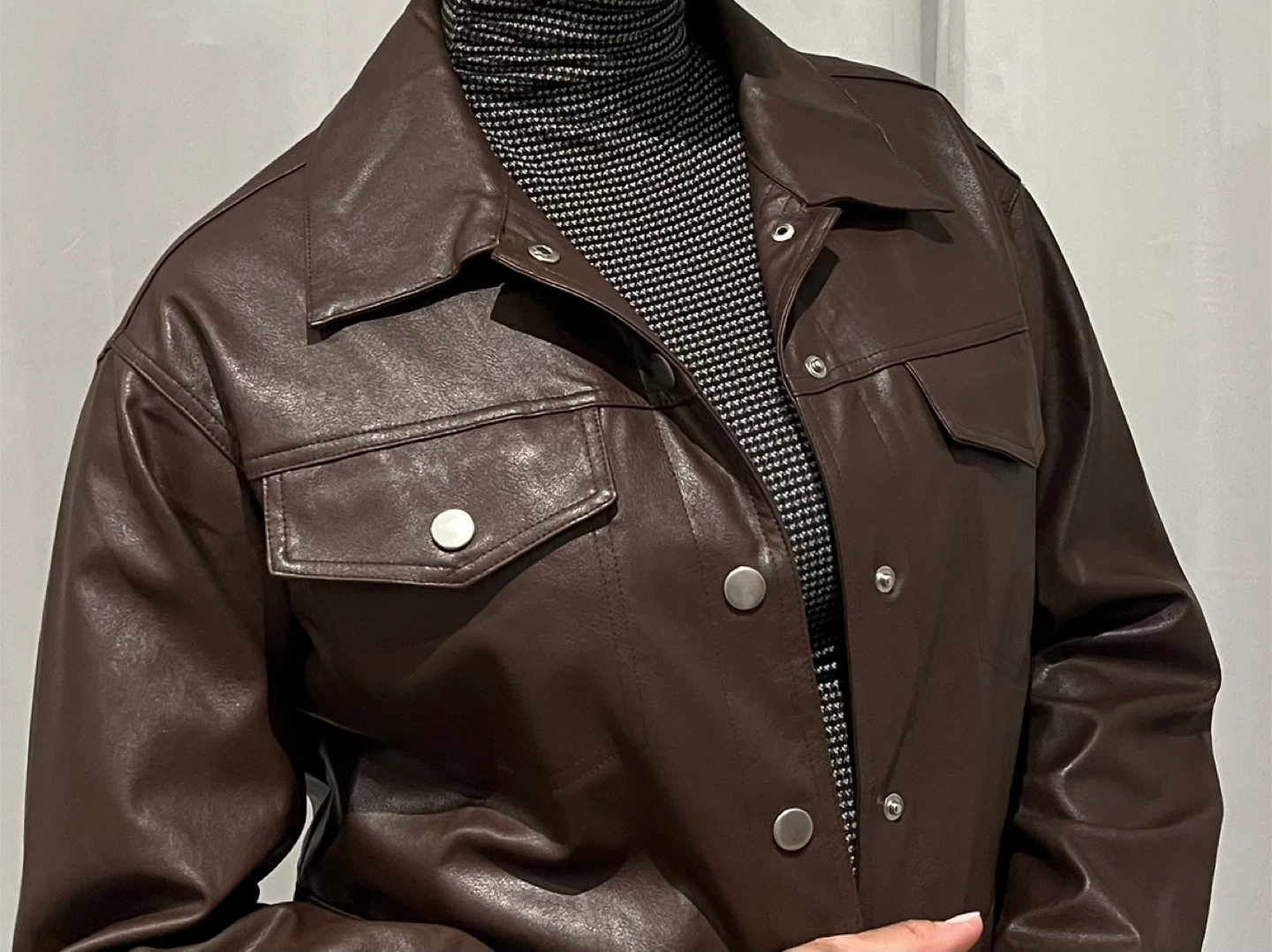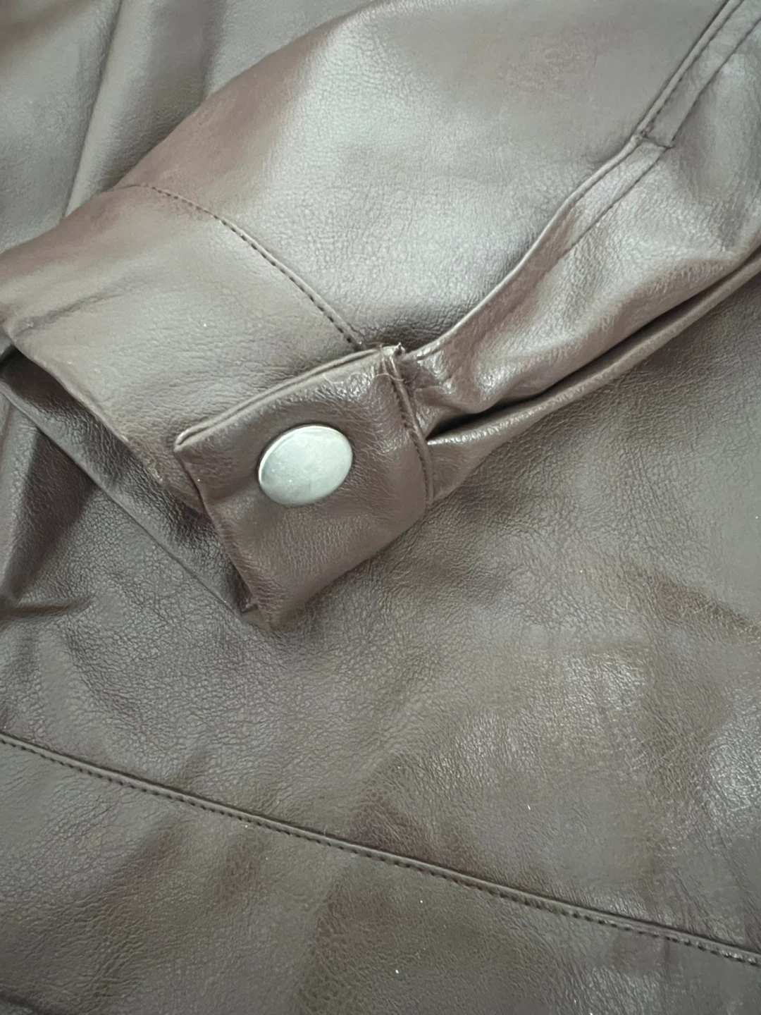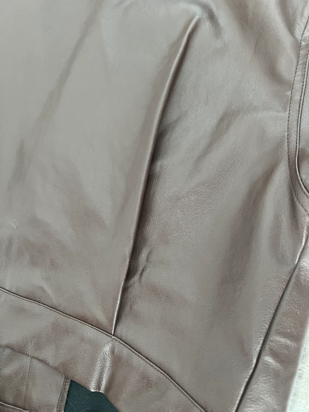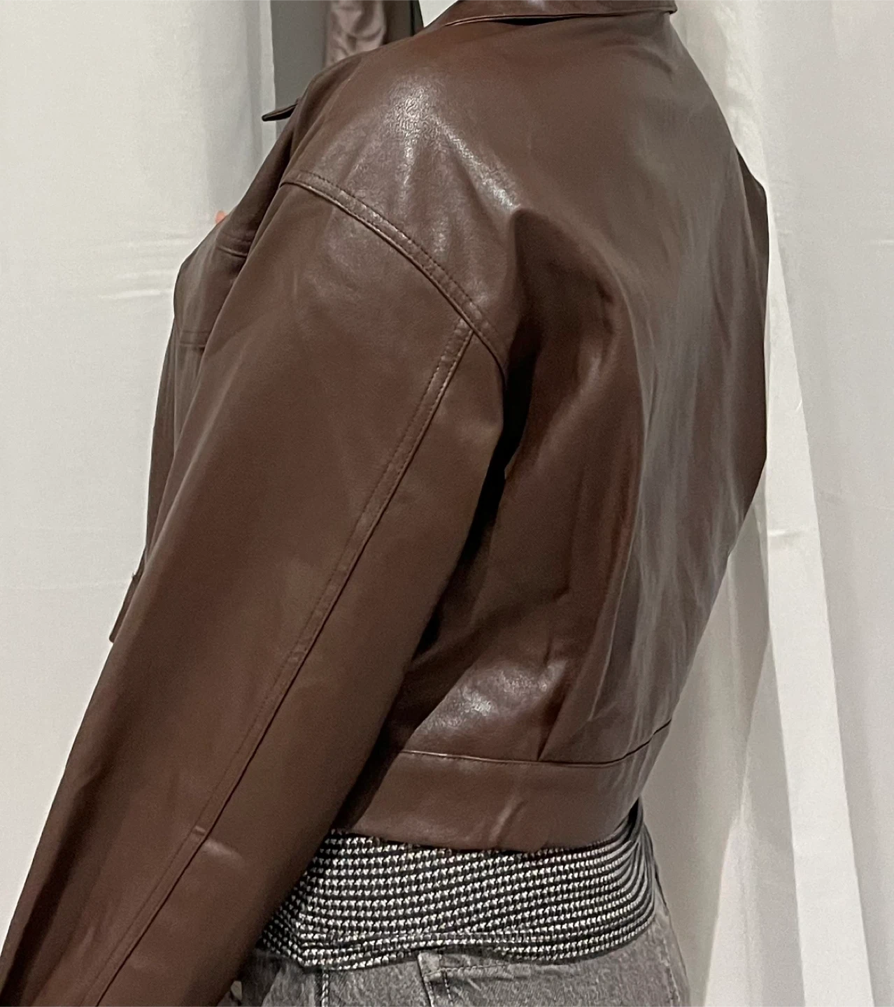 Selling a stylish brown faux leather cropped jacket. It's a great piece for layering and adding a bit of edge to your outfit! The jacket features a collared neckline, and functional pockets. It's in excellent condition and ready for a new home.