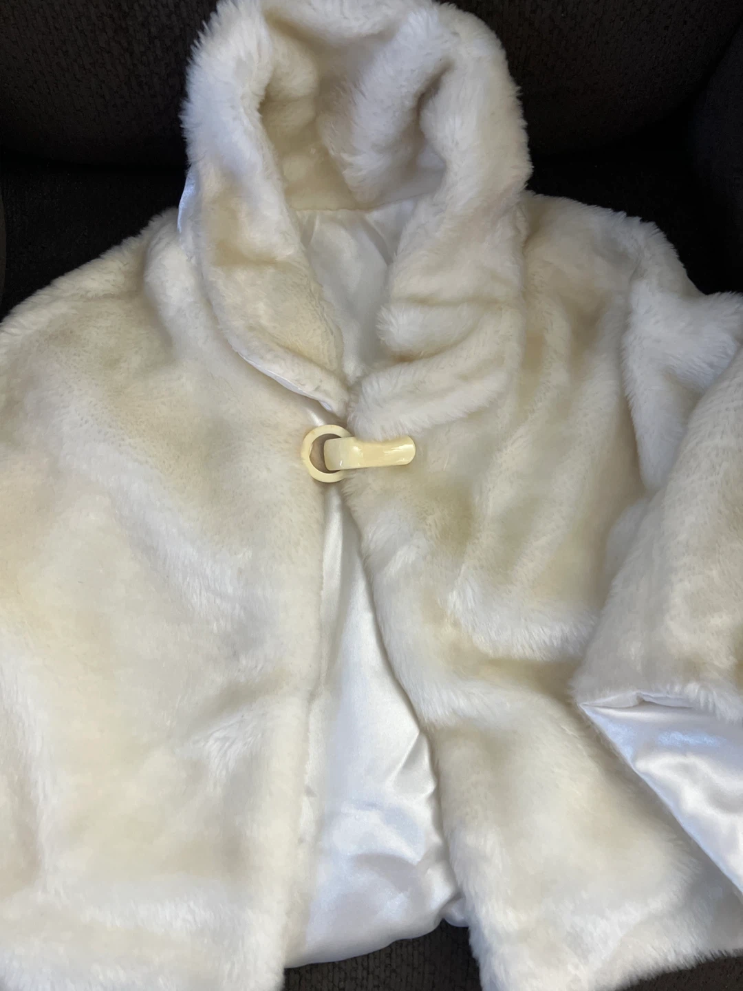 A beautiful white faux fur baby cape, perfect for keeping your little one warm and stylish! It's in great condition and features a soft, silky lining. A lovely addition to any baby's wardrobe for those chilly days
