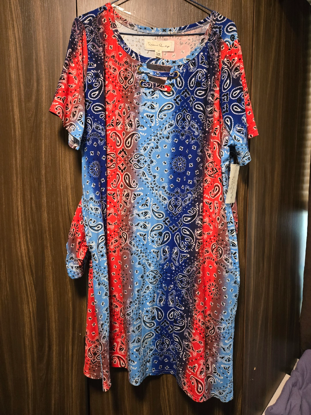 290This Bohemian Ridge dress is in great condition and ready for a new home! The size is 2X, and it features a unique paisley print in red, white, and blue. Perfect for a casual day out or a summer gathering
