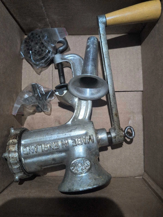 Heavy duty cast meat grinder, several blades and several size attachments. Feel free to message if you have any questions!