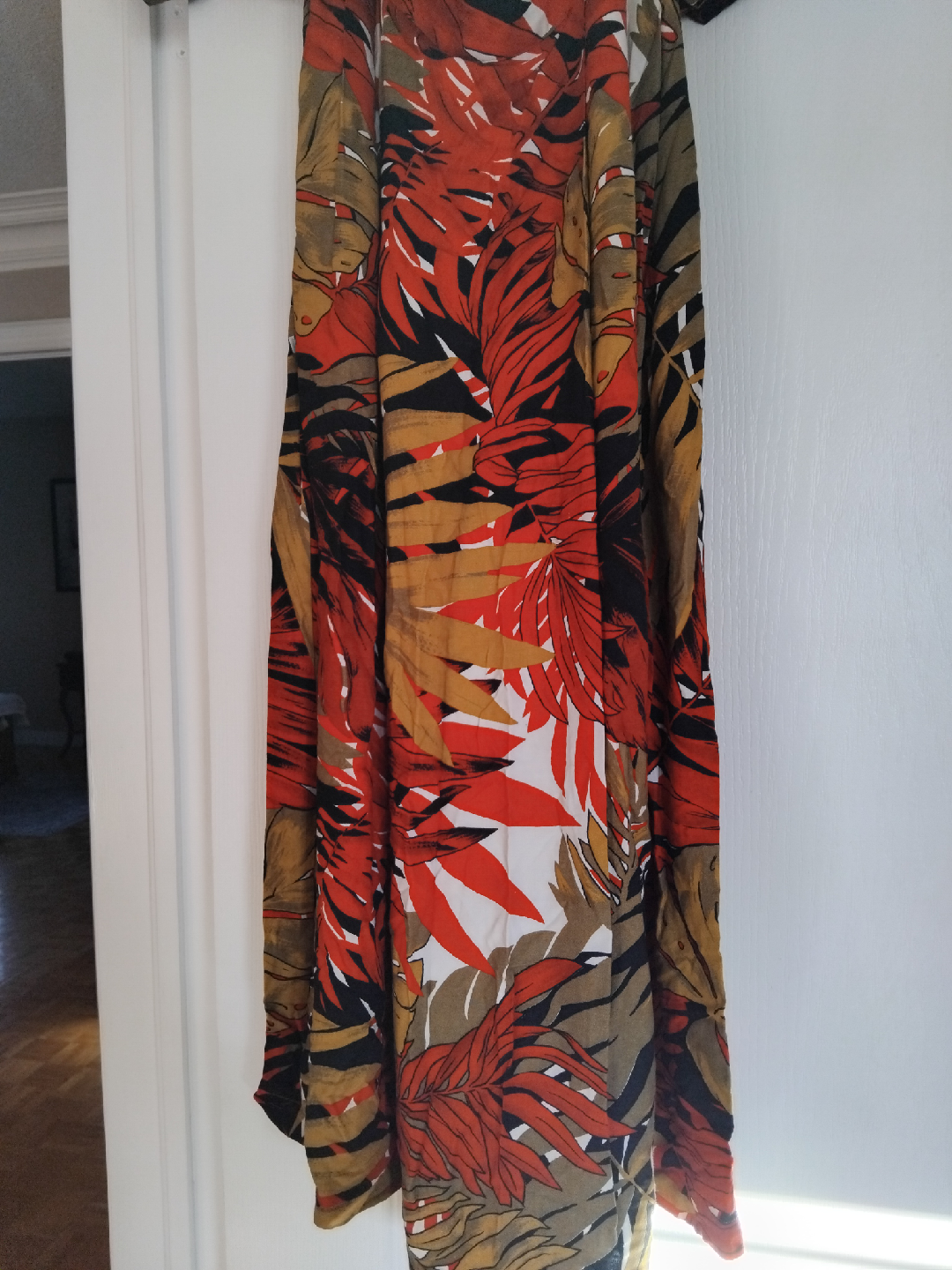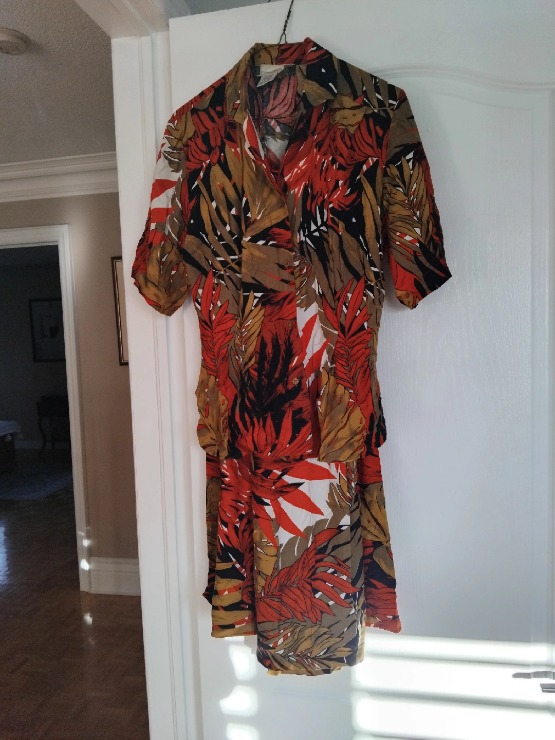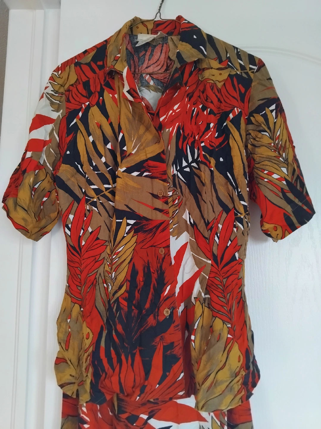 Selling a vintage blouse and skirt set with a vibrant leaf print. The colours are a mix of red, brown, black, and white. Perfect for adding a unique touch to your wardrobe!