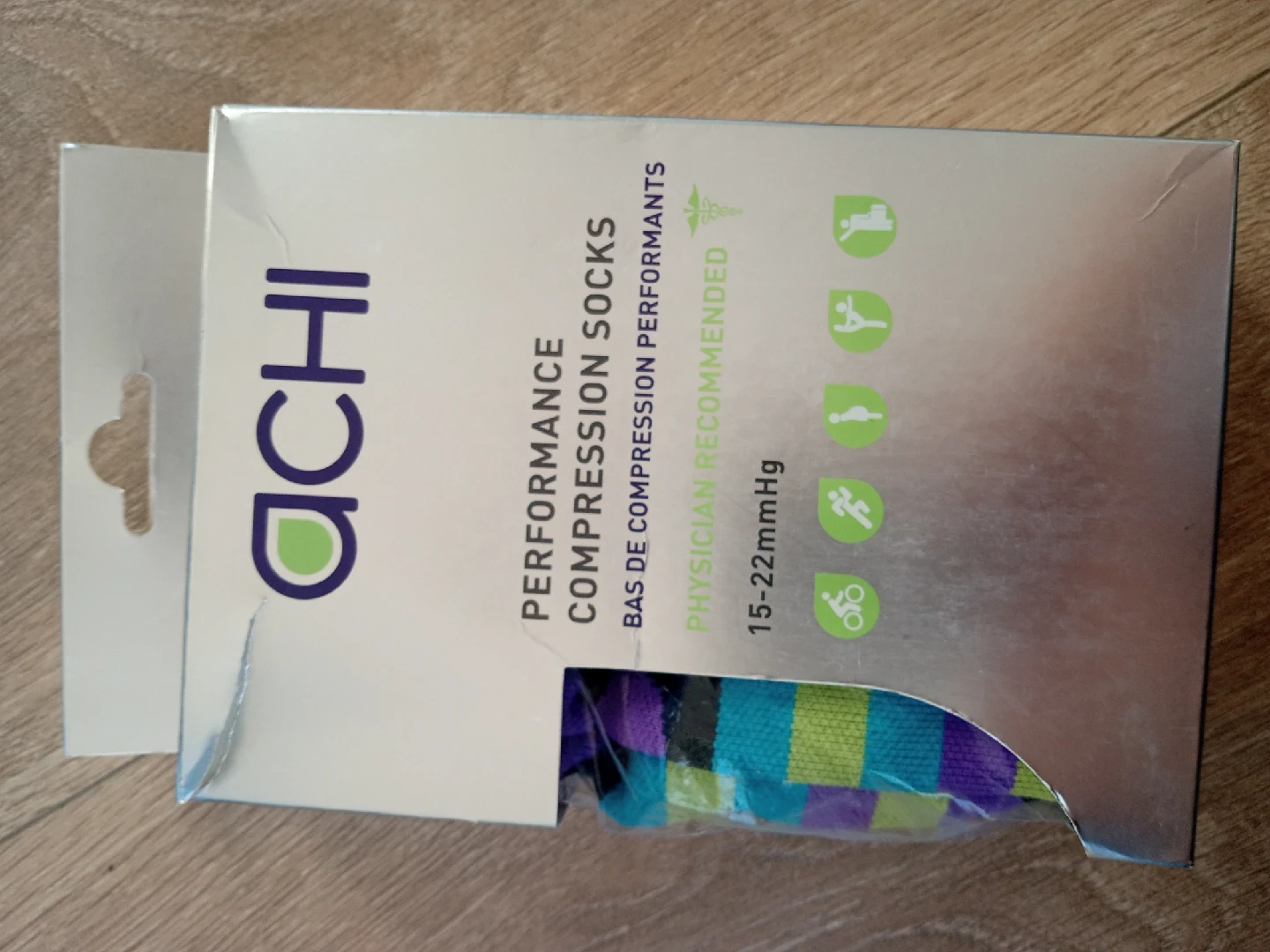 Selling a pair of ACHI medical grade compression socks. These socks are designed to provide support and aid in recovery. They offer 15-22mmHg compression. The material is made of Coolmax 40% nylon and 42% Lycra. The box is included. new, never worn. box is a bit beaten up.