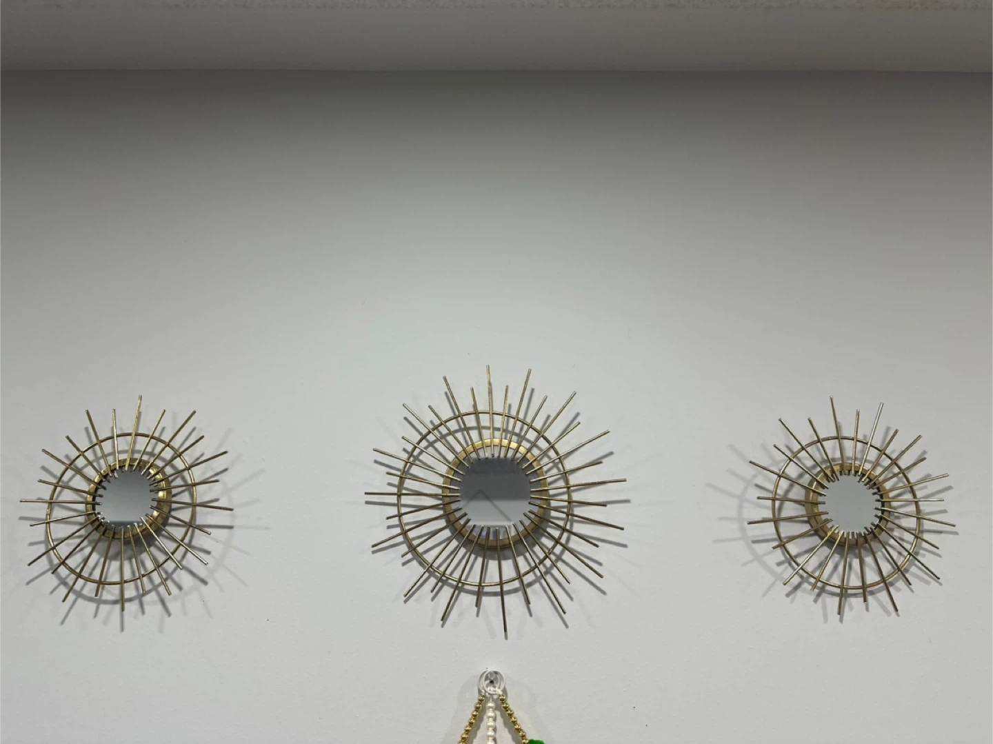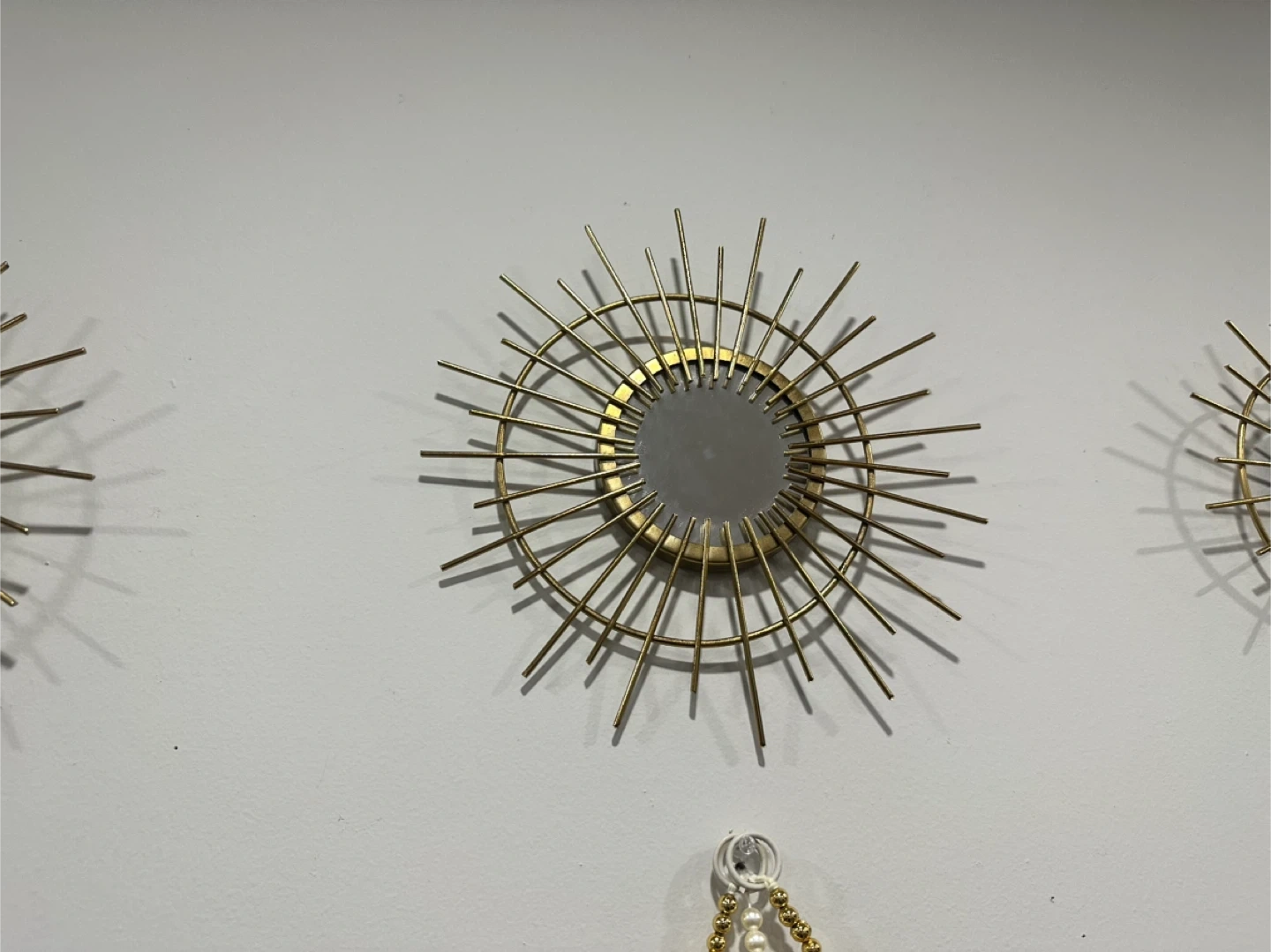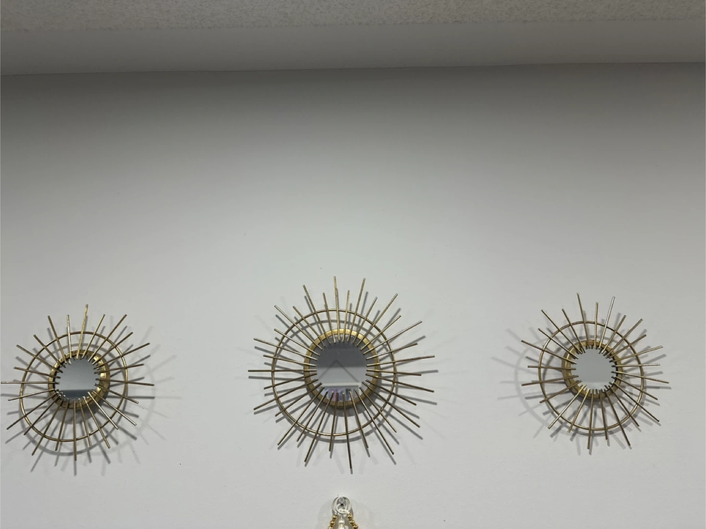 12Add a touch of sunshine to your space with this set of three sunburst mirrors! These gold-accented mirrors are perfect for adding a stylish and unique element to any room. They're in great condition and ready to brighten up your home