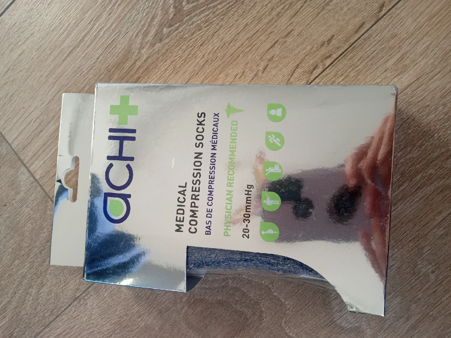 Selling a pair of Achi+ Medical Compression Socks in Denim Cool (Cotton Blend). They provide 20-30mmHg of compression. These socks are physician recommended and made of 52% lycra, 30% acrylic, and 18% nylon. new in box.