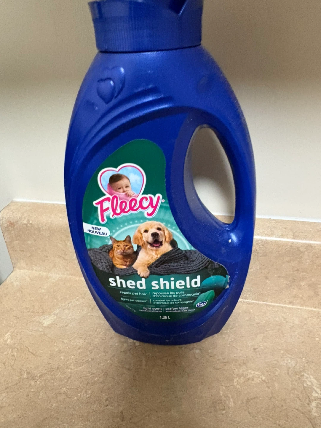 I'm selling a bottle of Fleecy Shed Shield fabric conditioner. It's designed to repel pet hair and fight pet odours, leaving a light scent. The bottle contains 1.36 L of fabric conditioner.